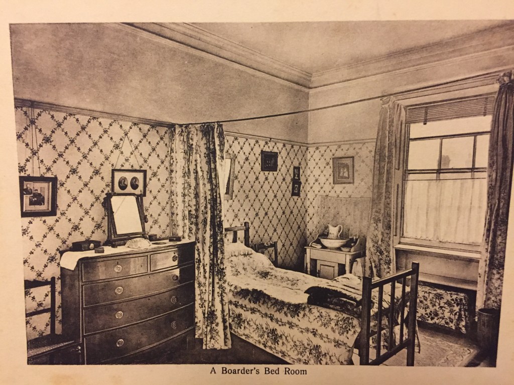 The grounds are lovely, with two tennis courts, and a beautiful pergola at the end over which the sweetest roses climb, but the thing I like best is the mulberry tree.  We have the most glorious oak hall which Lady Tate (Our “Fairy Godmother”) gave us.  It is the best Hall that any school possesses in the whole of England, and it goes by the name of “The Amy Lefroy Hall”.