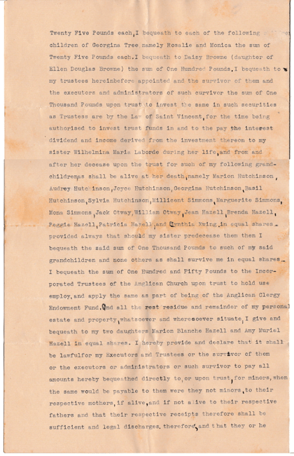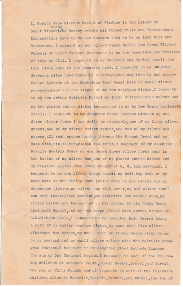 This is the draft of a will of my great-grandmother Marion Hazell. I enjoy the feminist touches, when she leaves money clearly to the women of the family first, and I also appreciate the silver bonbon dishes and vase which have been handed down to me.