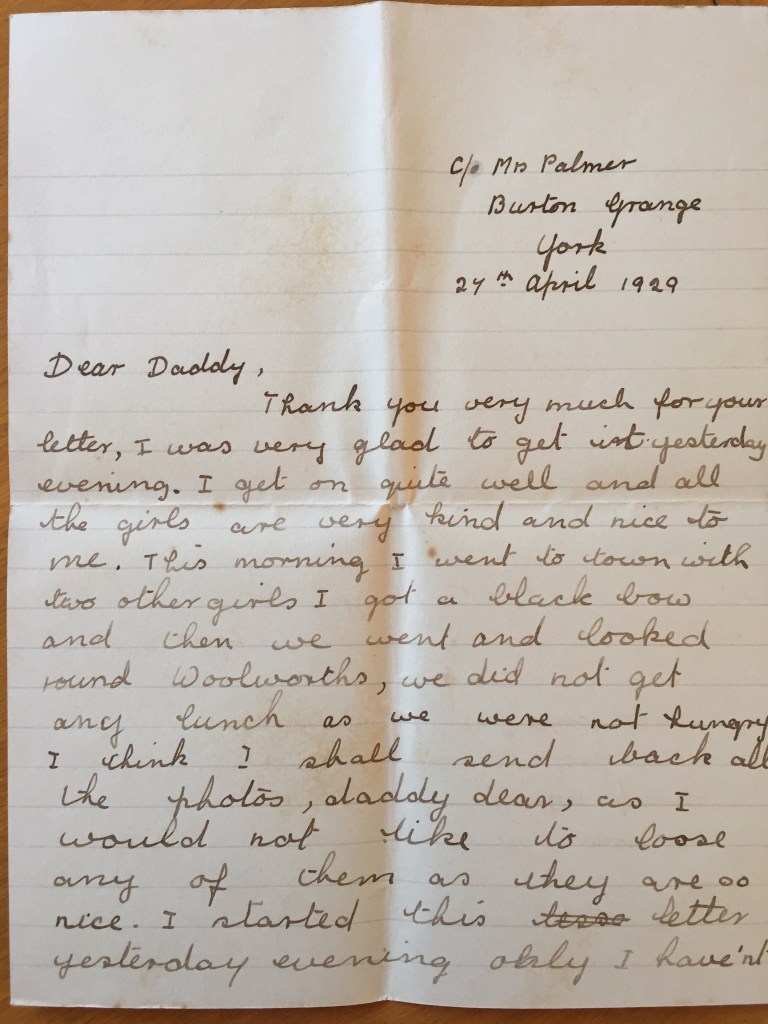 In the summer term of 1929, Cynthia Ewing, who had just turned 14, was sent to boarding school in York. This is when her letters home to her parents in Newcastle began. Her mother saved only the letters from her first term, but she stayed at this school for the next few years, as she met new friends, had new experiences, in fact, grew up. I remember her complaining that changing schools affected her knowledge of English history, as she repeated lessons on the Tudors several times, but never did deal with the eighteenth century. Her handwriting also changed over the years at boarding school, from the script you see in these letters to what she used as an adult.