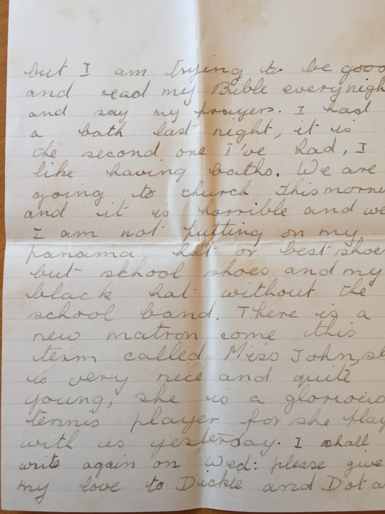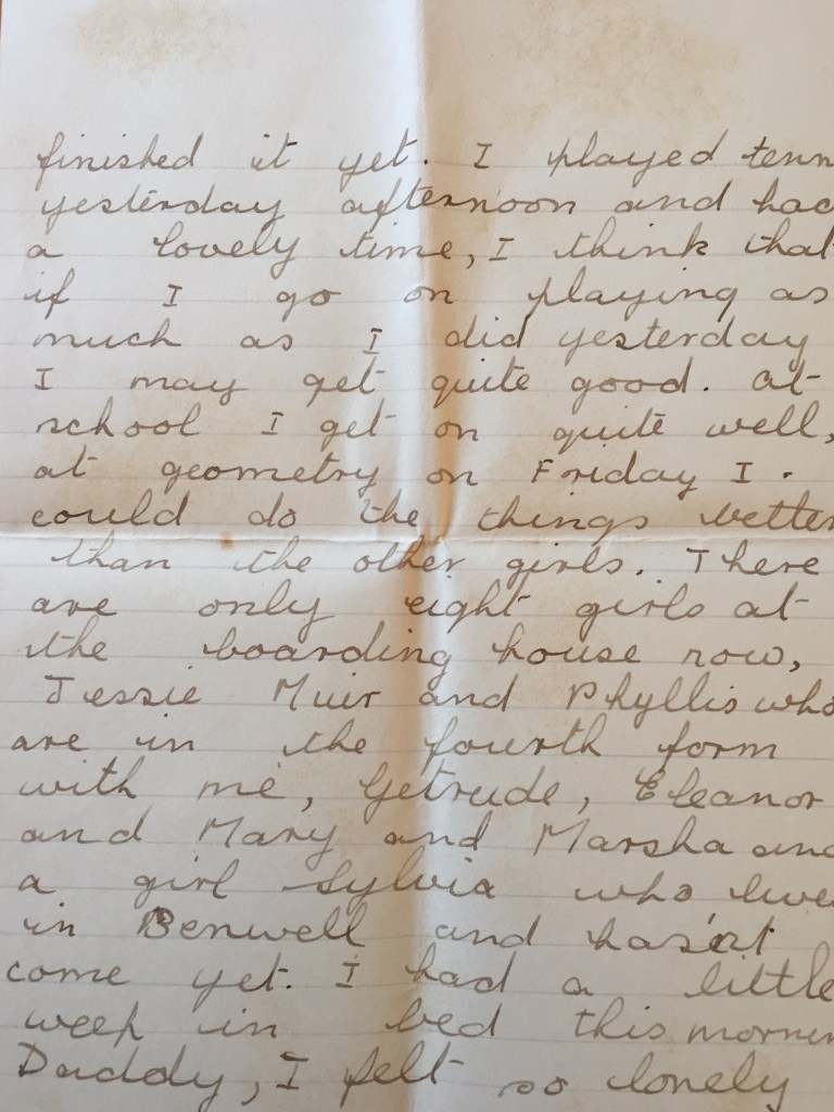 Thank you very much for your letter, I was very glad to get it yesterday evening, I get on quite well and all the girls are very kind and nice to me. This morning I went to town with two other girls I got a black bow and then we went and looked round Woolworths, we did not get any lunch as we were not hungry. I think I shall send back all of the photos, daddy dear, as I should not like to loose any of them as they are so nice. I started this letter yesterday evening only I haven’t finished it yet. I played tennis yesterday afternoon and had a lovely time, I think that if I go on playing as much as I did yesterday I may get quite good. At school I get on quite well, at geometry on Friday I could do the things better than the other girls. There are only eight girls at the boarding house now, Jessie Muir and Phyllis who are in the fourth form with me, Gertrude, Eleanor and Mary and Marsha and a girl Sylvia who lives in Benwell and hasn’t come yet. I had a little weep in bed this morning Daddy, I felt so lonely but I am trying to be good and read my Bible every night and say my prayers. I had a bath last night, it is the second one I’ve had, I like having baths. We are going to church this morning and it is horrible and wet, I am not putting on my panama hat or best shoes but school shoes and my black hat without the school band. There is a new matron come this term called Miss John, she is very nice and quite young, she is a glorious tennis player for she played with us yesterday. I shall write again on Wed: please give my love to Dickie and Dot and Nancy and I still love you with heaps and heaps of love and I’m longing for the holidays to come so that I can see you and Mummy again, please write again soon to your loving little girl Cynthia.