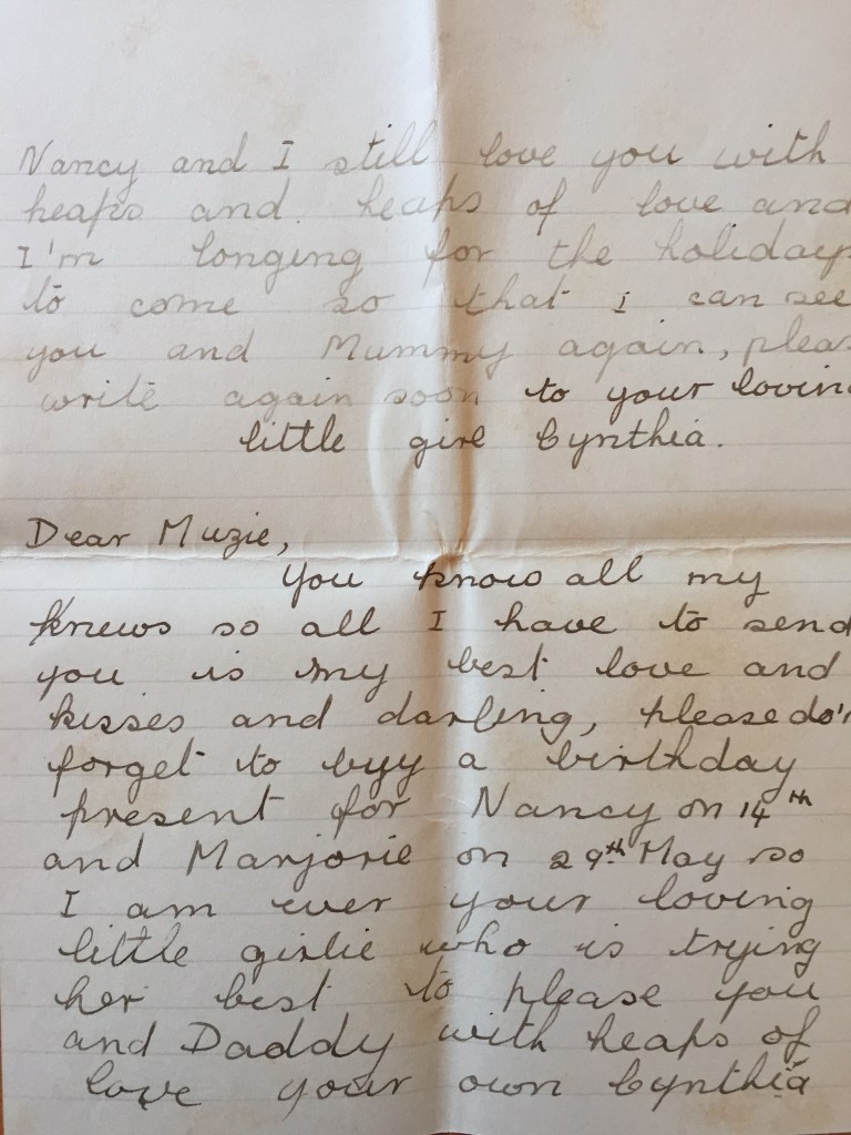 You know all my news so all I have to send you is my best love and kisses and darling, please don’t forget to buy a birthday present for Nancy on 14th and Marjorie on 29th May so I am ever your loving little girlie who is trying her best to please you and Daddy with heaps of love your own Cynthia.
