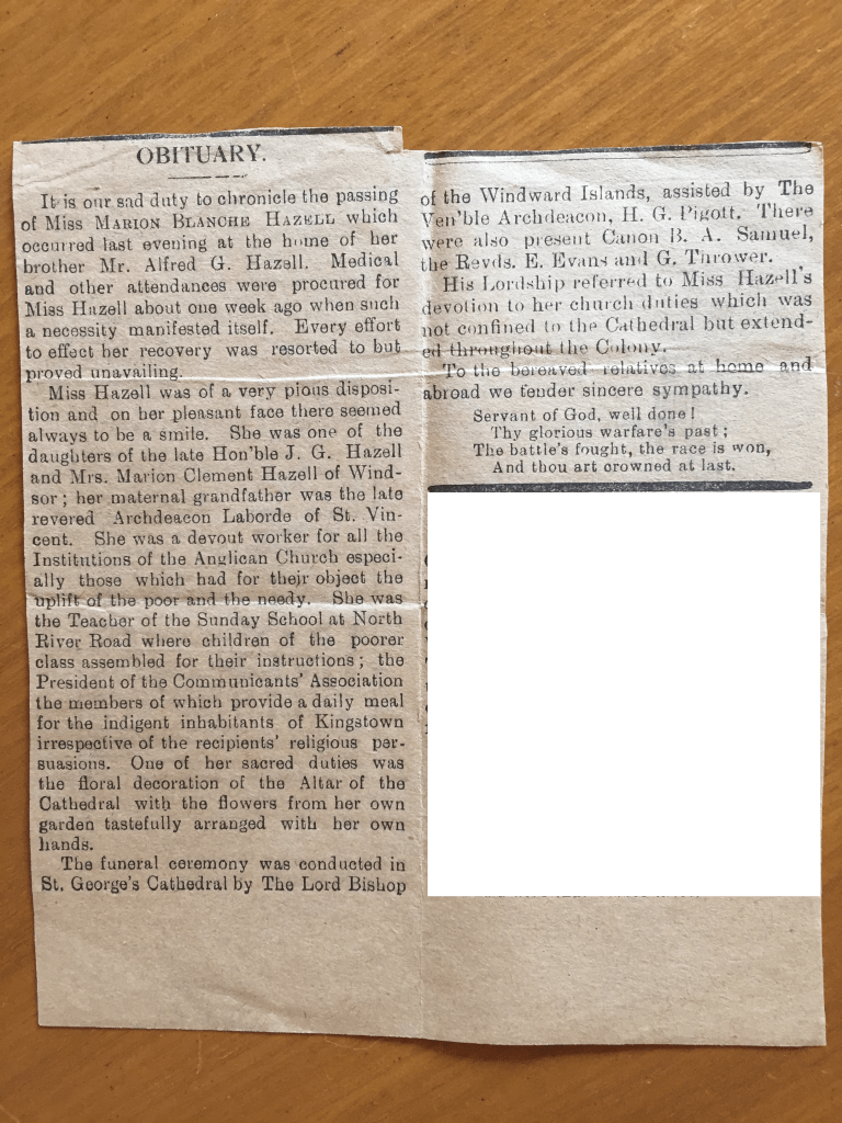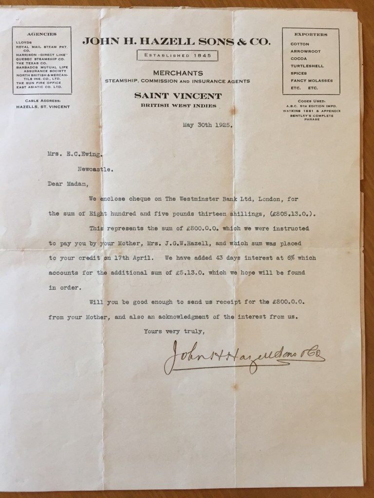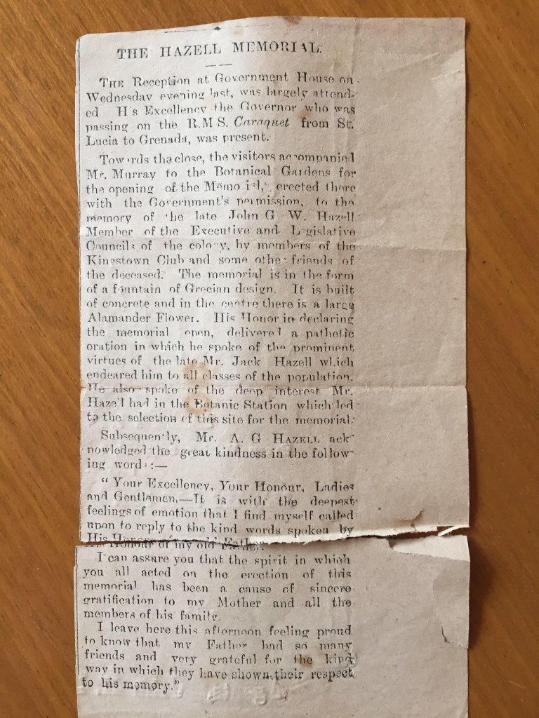 Before I follow Cynthia as she grows up in the 1930s, there are a few Hazell documents that pertain more to her mother Carol. Her family in St Vincent sent her newspaper clippings about her father’s memorial in the Botanical Gardens in St. Vincent, and the death of her sister Blanche. Her mother sent money from the family business.