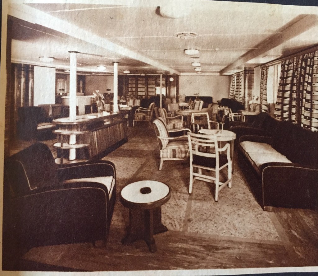 Nice bright day & the sea much calmer- Peggy up & feeling quite all right. Talked to an amusing American man called Gup! Had a rash bet with him over the nationality of a girl– I bet him anything she wasn’t English- she was! He threatens to collect. Played deck games. John with another new girlfriend! This time an American girl who has lived nearly all her life in Bruges- Rosemary! Played games in the afternoon. Talked to Herbert & Harry.