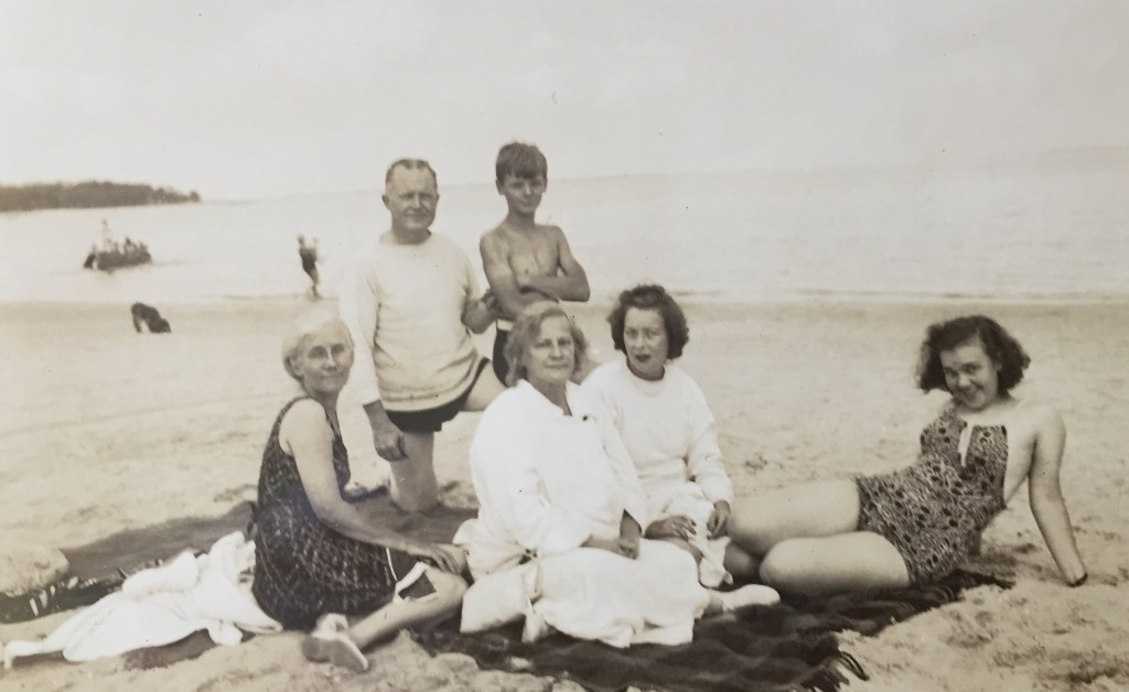 Up & after a while Aunt Trix, Peg, Mum & I to Jamaica to shop. Rainy – hot & steamy. Got presents – Mum a hat & shoes- me a muslin evening dress – white with red spots! Such a job getting everything. Home eventually covered with parcels.