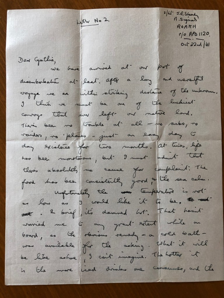 We have arrived at our port of disembarkation at last. After a long and uneventful voyage we are within striking distance of the unknown. I think we must be one of the luckiest convoys that ever left our native land. There’s been no trouble at all- no subs, no raider, no ‘planes- just an easy day to day existence for two months. At times, life has been monotonous, but I must admit that there’s absolutely no cause for complaint: The food has been consistently good, & the sea calm.