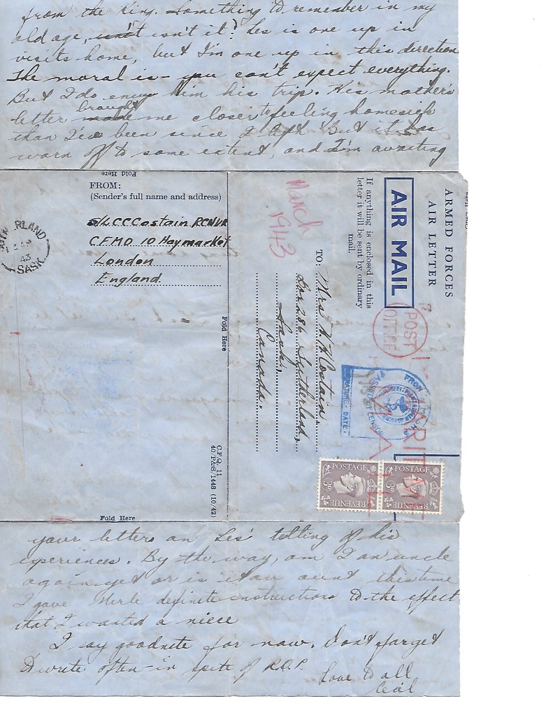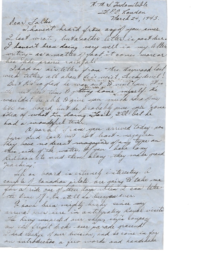 Radar was a new technology that made a difference to both sea and air conflict. Canada loaned newly trained radar officers to the British Navy because sadly, so many British radar officers had been lost in the Mediterranean during the early years of the war. Cec was posted to H.M.S Indomitable, an aircraft carrier, in the Mediterranean, but the ship was damaged, and had to go to the USA for repairs. Cec told us that as the wounded ship was crossing the North Atlantic, they hit a tremendous storm that rolled up the flat top of the deck like a can opener! Once the extensive repairs were done, they returned to England for new equipment and their aircraft. So the first letter we have is written from England, where Cec had met King George VI. The handshake meant Cec was close enough to see that the King wore thick pancake makeup.
