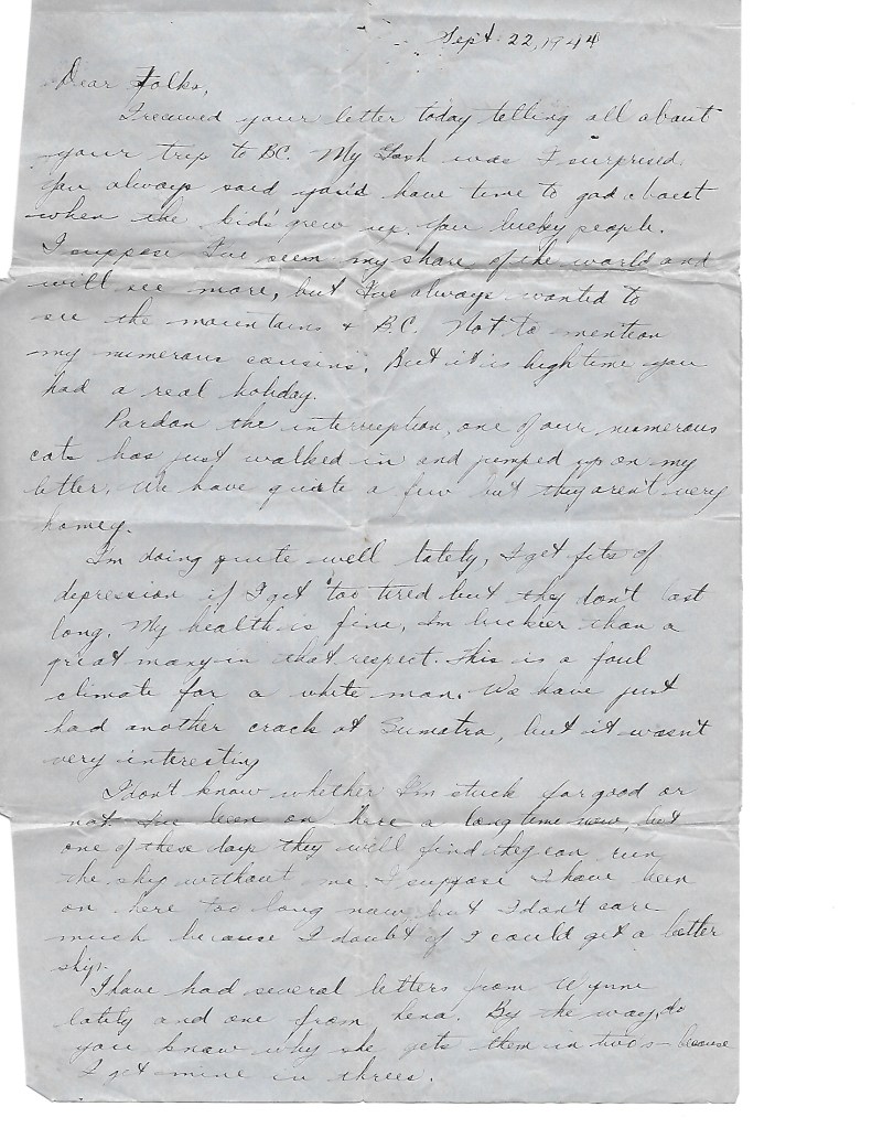 I received your letter today telling all about your trip to BC. My Gosh was I surprised. You always said you’d have time to gad about when the kids grew up. You lucky people. I suppose I’ve seen my share of the world and will see more, but I’ve always wanted to see the mountains and BC. Not to mention my numerous cousins. But it is high time you had a real holiday.