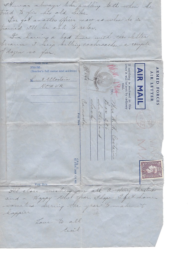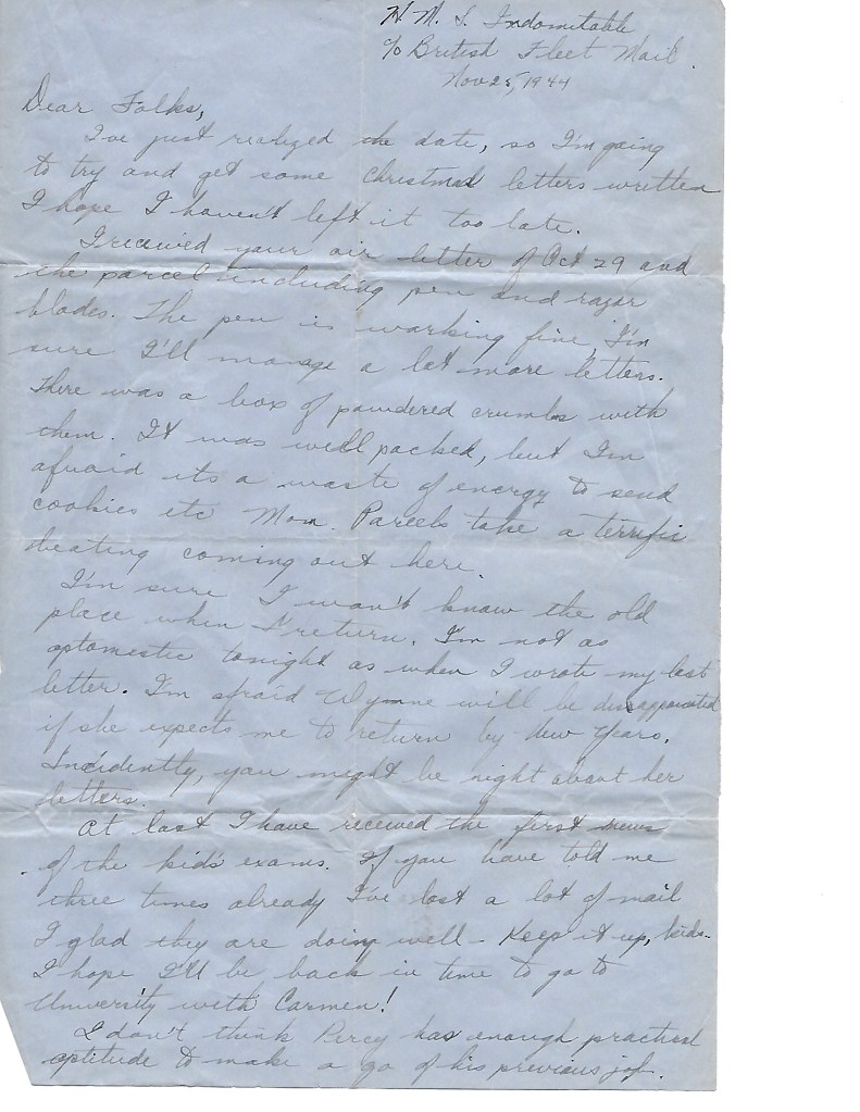 I received your letter of Oct 29 and the parcel including pen and razor blades. The pen is working fine. I’m sure I’ll manage a lot more letters. There was a box of powdered crumbs with them. It was well packed, but I’m afraid it’s a waste of energy to send cookies etc. mom. Parcels take a terrific beating coming out here.