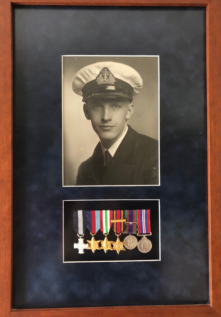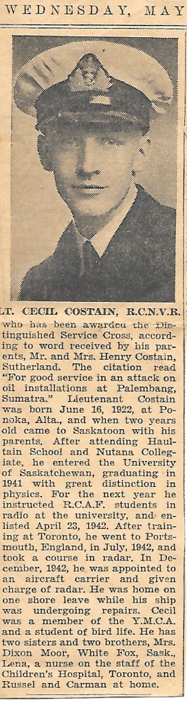 In 1971 Dr Gerhard Herzberg, the Director of the Pure Physics Division of the National Research Council of Canada (NRC), Cec’s boss, won the Nobel Prize for Chemistry. It was an honour, and thrill for all in the NRC, and also somewhat of a joke, since Dr. Herzberg was, to everyone, a physicist! To honour Dr. Herzberg, the Governor General gave a dinner and reception, the NRC scientists were invited, the invitation stating that medals were to be worn. So Cec had miniatures of his medals ‘suitable for wearing with evening dress’ made, and that is how I own a picture of the young Lieutenant Commander C.C.Costain, with his medals.