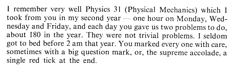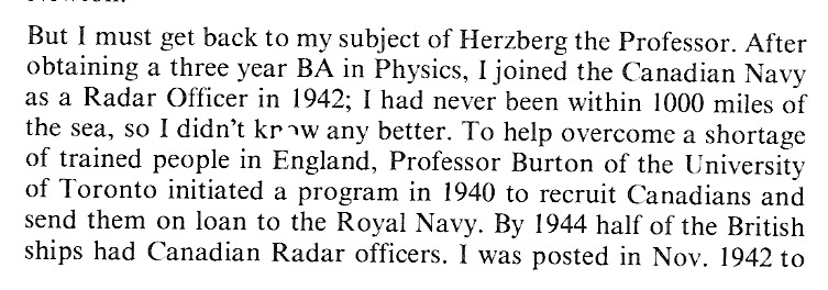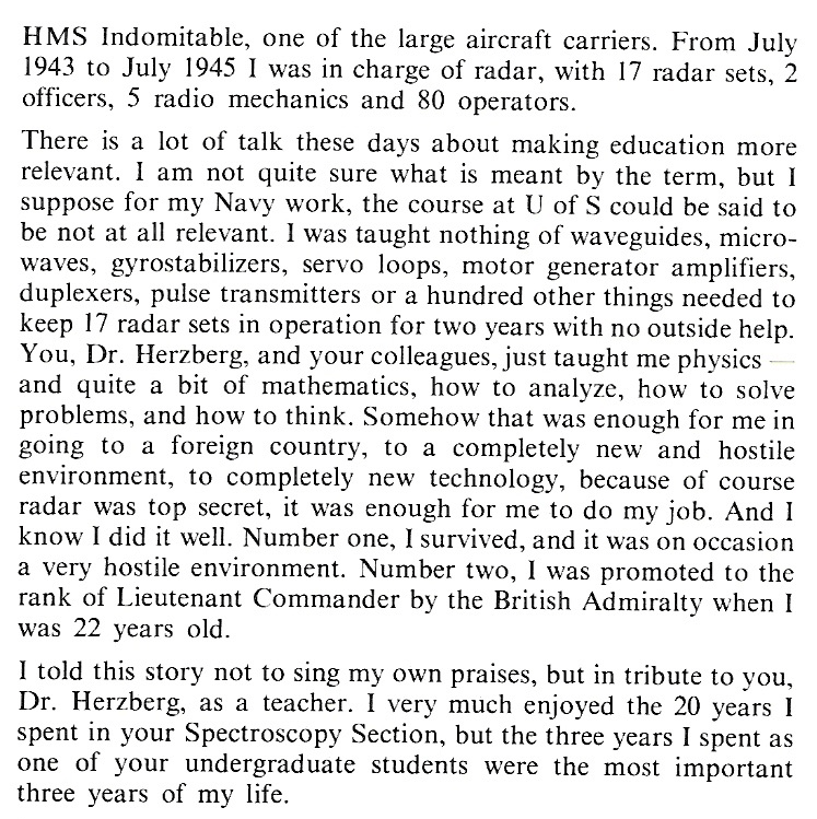 At a tribute to Dr. Herzberg years later, Cec gave a speech about the time before Herzberg joined the NRC, the time in the 1930s when Professor Herzberg, seeing the writing on the wall in an increasingly Nazified Germany, accepted a guest Professorship at the University of Saskatchewan, moved with his wife Luise to Canada, started a family, and educated Cec Costain and many other future Canadian physicists. Here he is, addressing his former professor:
