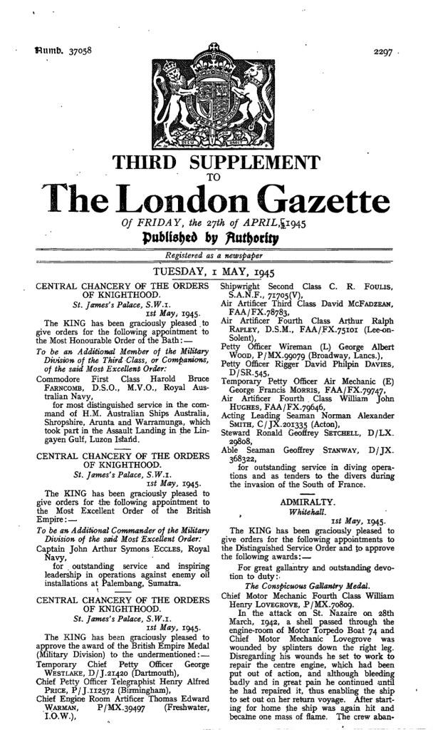 A clipping from the local newspaper saved by his proud parents, and The London Gazette, a link with Nelson, provide documentary proof.