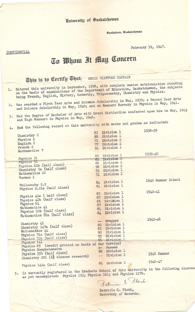 However it was arranged with the Admiralty, Cec returned to Saskatoon in 1945 and continued his education as planned in the fall.