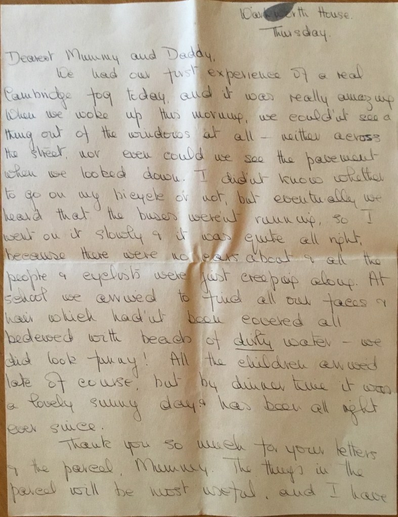 We had our first experience of a real Cambridge fog today and it was really amazing. When we woke up this morning, we couldn’t see a thing out of the windows at all – neither across the street, nor even could we see the pavement when we looked down. I didn’t know whether to go on my bicycle or not, but eventually we heard that the buses weren’t running, so I went on it slowly & it was quite all right, because there were no cars about & all the people & cyclists were just creeping along. At school we arrived to find all our faces & hair which hadn’t been covered all bedewed with beads of dirty water – we did look funny! All the children arrived late of course, but by dinner time it was a lovely sunny day & has been all right ever since.