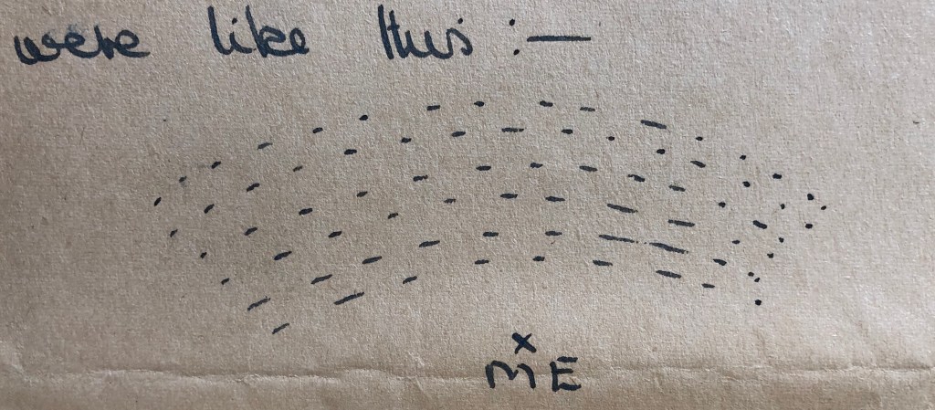 Monday & Tuesday, I didn’t seem to do anything at all, but Wednesday was the day of my talk. I had it all planned out & parts of it written, so that I knew exactly what I was going to say, but I didn’t even look at it at the time, I just remembered it and talked. I went to work in the morning all dressed up for it, in my blue corduroy suit, black hat etc. as I had to go straight after work. In the middle of the morning along came a Mrs. Schwenke(!) one of the English teachers, & asked me if I’d like to come with her & her class to a lecture at the Art Museum on Ballads. Of course I said yes, & Mr. Nautes thought it would be nice for me to go too, so I put work on the blackboard & after I had lunch, I just stayed for half of my home room and then went. Mrs. S. took me down in her car, & then we went to the lecture which was very interesting & quite a lot of students from the high schools & there was a singer & also some records, & some songs we all sang & there were slides too, of various types of architecture, to go with the period of the ballad, so it was very interesting. It finished at 3 o’clock & then Miss S took me to the place where the tea was, & I retired & powdered my nose, & then blew in. I was greeted by everyone & presented with a huge corsage of pinky-flame gladiolas & tiny button dahlias, all tied with ribbon. It was gorgeous but by the time I had it draped down one shoulder, I felt positively weighted down! Miss Kaya was there too, & there was a press photographer & reporter, who asked us all sorts of questions. I was too scared to have much tea- only one cup & a piece of cake- and then the Chairman introduced me & up I got. The chairs were like this:-
