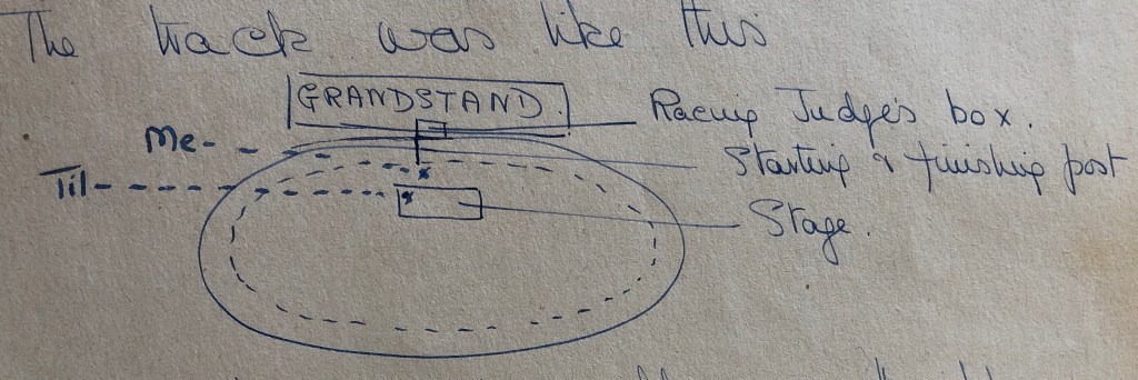 In the afternoon Til had to go to the Lucas County Fair, where she was judging a Children’s Talent Show, so I went along too. I didn’t see any of the Fair, which I was sorry about, because the Talent Show was held at the race track! The track was like this