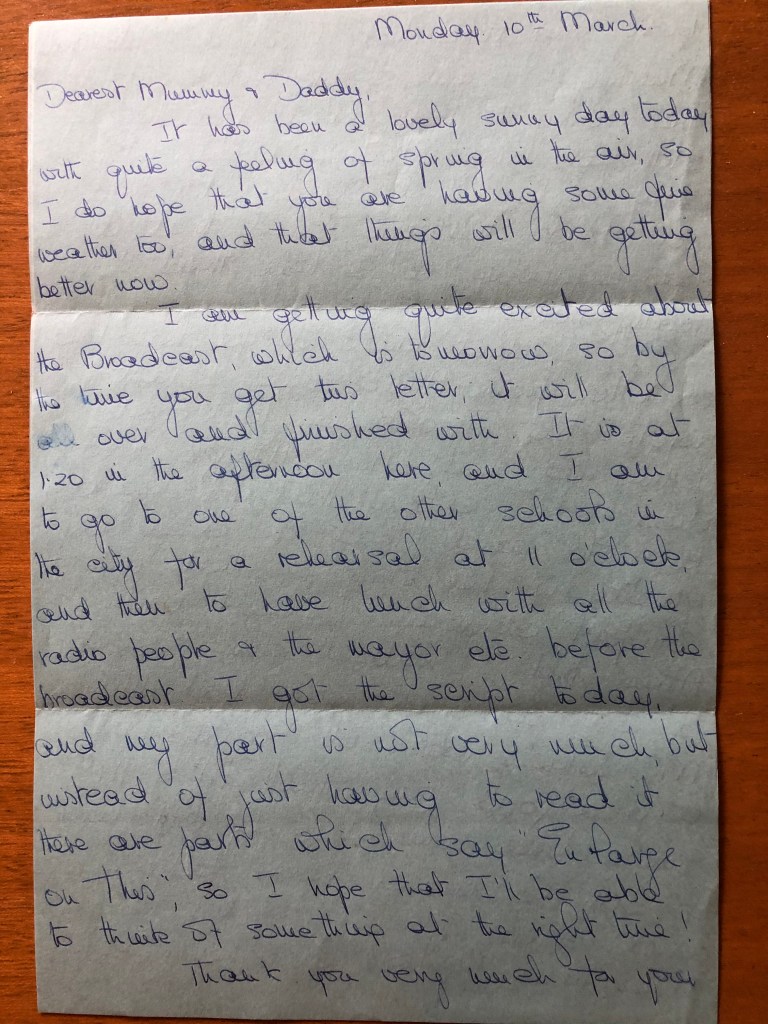 I am getting quite excited about the Broadcast, which is tomorrow, so by the time you get this letter, it will be all over and finished with. It is at 1.20 in the afternoon here, and I am to go to one of the other schools in the city for a rehearsal at 11 o’clock, and then to have lunch with all the radio people & the mayor etc. before the broadcast. I got the script today, and my part is not very much, but instead of just having to read it there are parts which say “Enlarge on this”, so I hope that I’ll be able to think of something at the right time!