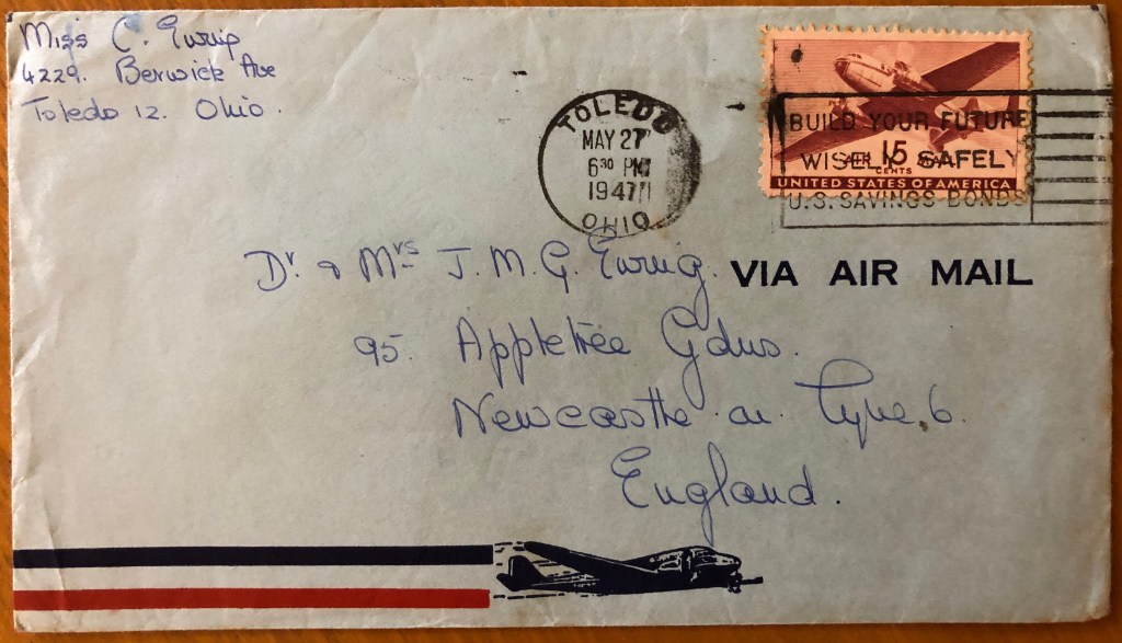 On Sunday I got up & went to Early Service, & then it was very dull & rainy & I spent the time doing odd jobs. By late afternoon it had cleared up so Lois & Til & I went a drive & had dinner in a nice little hotel, & came home and went to bed early. I will stop now before I use another sheet as there is no more news. Thank you for your letter, Mummy, take care of yourselves.