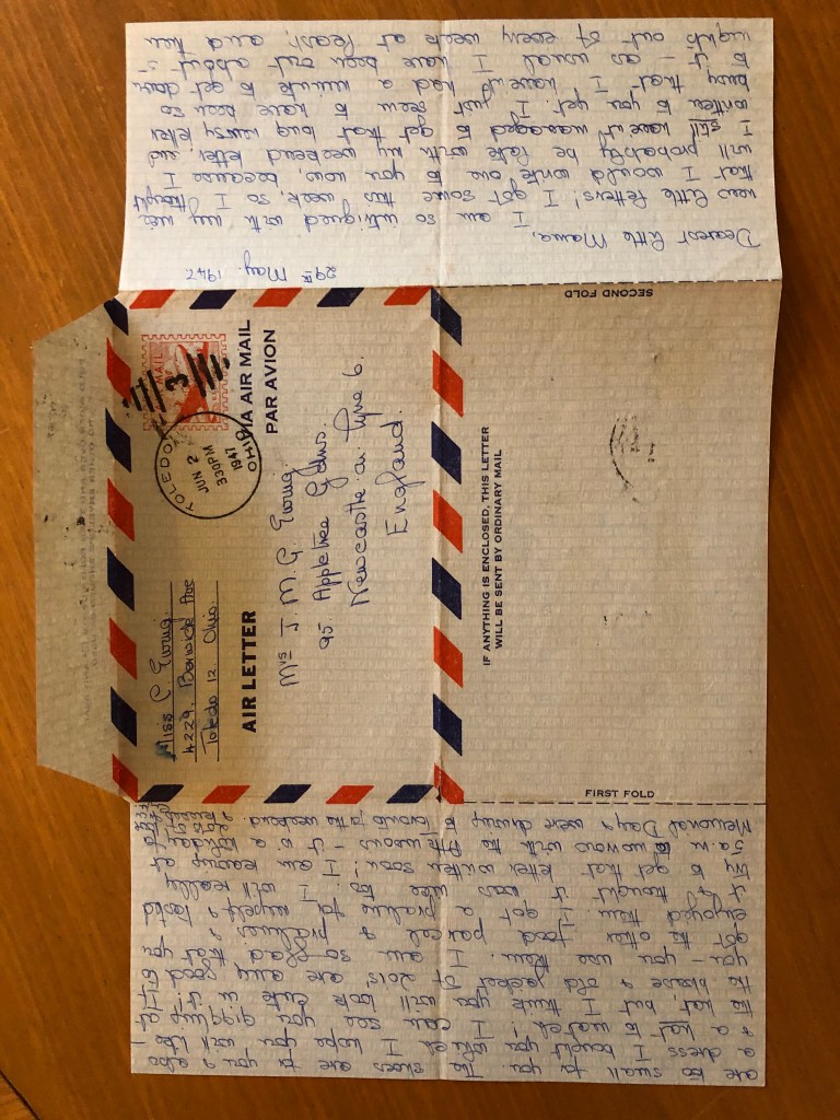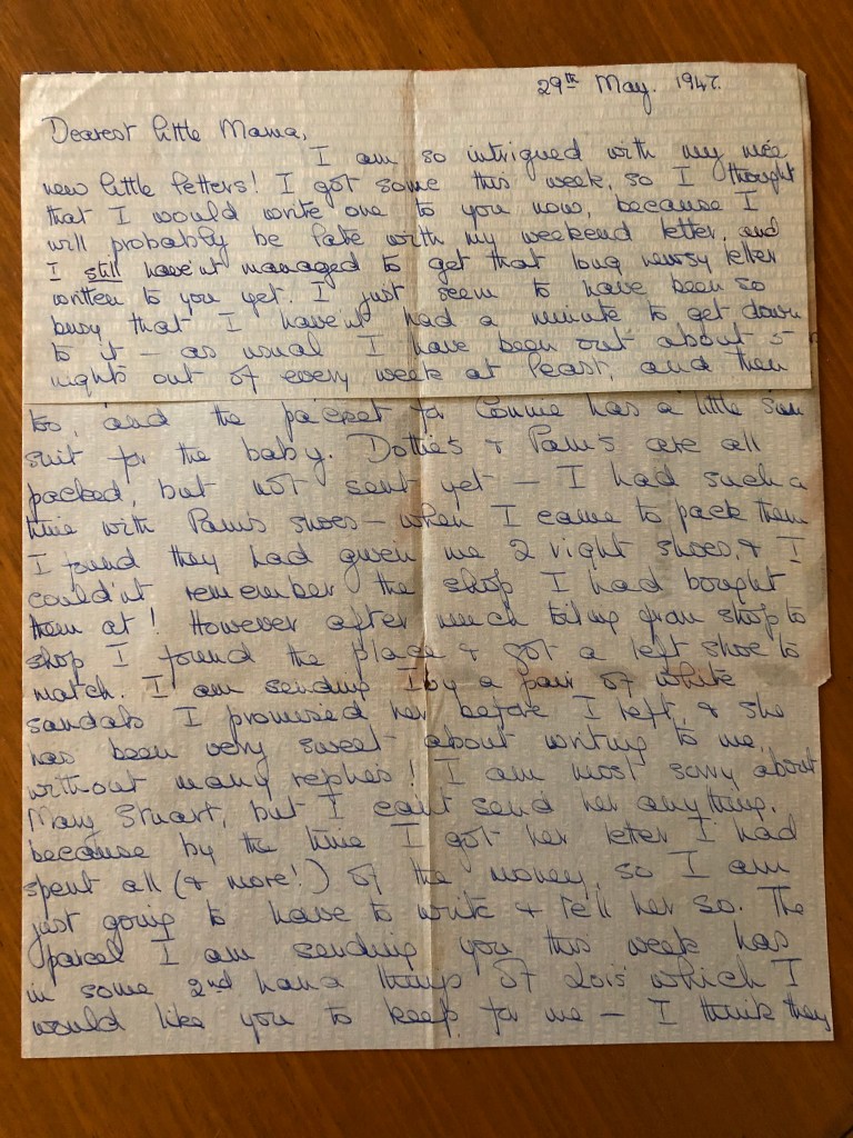 I am so intrigued with my nice new little letters! I got some this week, so I thought that I would write one to you now, because I will probably be late with my weekend letter, and I still haven’t managed to get that long newsy letter written to you yet. I just seem to have been so busy that I haven’t had a minute to get down to it – as usual I have been out and about 5 nights out of every week at least, and then I have also been shortening some new summer dresses I got, and lengthening my last year’s dresses, which now seem very short. In addition to that I have been having such a time packing & sending off the girl’s parcels – and I’m still not finished! I sent off I think it was 7 parcels on Saturday – cost me $8.00! One for Irene, three for Nan, two for Marjorie (Laing) one for you, and a little packet for Connie Fairlamb. I still have one for Dottie, one for Pam, one other for you, and one for my pal Ivy in Cambridge! Irene’s has her clothes + 2nd hand clothes, one of Nan’s is the same, another is food and the third is her wedding present – I have sent her a cream candlewick bed cover & a blue double bed blanket. They are both lovely & I was very pleased because I got them at a sale & so they were reduced a bit, but I haven’t paid for them yet! Both Marjorie’s parcels are food, & the parcel I sent to you is food too, & the packet for Connie has a little sun suit for the baby. Dottie’s & Pam’s are all packed, but not sent yet- I had such a time with Pam’s shoes- when I came to pack them I found they had given me 2 right shoes, & I couldn’t remember the shop I had bought them at! However after much toiling from shop to shop I found the place & got a left shoe to match. I am sending Ivy a pair of white sandals I promised her before I left, & she has been very sweet about writing to me, without many replies! I am most sorry about Mary Stuart, but I can’t send her anything, because by the time I got her letter I had spent all (& more!) of the money, so I am just going to have to write & tell her so. The parcel I am sending you this week has in some 2nd hand things of Lois’ which I would like you to keep for me – I think they are too small for you. The shoes are for you & also a dress I bought you which I hope you will like- and a hat to match! I can see you giggling at the hat, but I think you will look cute in it! If the blouse & old jacket of Lois’ are any good to you- you use them. I am so glad that you got the other food parcel & pralines & enjoyed them. I got a praline for myself & tasted it & thought it was nice too. I will really try to get that letter written soon! I am leaving at 5 a.m. tomorrow with the Atkinsons – it is a holiday for Memorial Day & we are driving to Toronto for the weekend.
