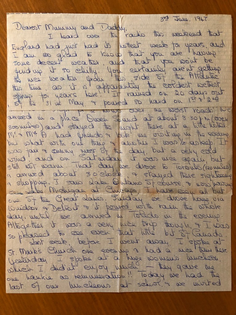 Last weekend we had a holiday, because Friday was Memorial Day, which is a public holiday. Mr. & Mrs. Atkinson had spoken to me for a long time about their taking me a motor trip over this weekend so it was arranged that we would go to Canada. They called for me at 5 A.M. on Friday morning & we drove up to Detroit and then on up north along Lake Saint Clair to a town called Sarnia where we crossed into Canada. The frontier is on a beautiful bridge over the St. Clair River just where it runs into Lake Huron, and it is really lovely. After that we drove on north through Southern Ontario, along Lake Huron – pretty country, but rough roads and very poor stony soil. I sat in the back as Mrs. A. gets car sick, and they had conveniently put a pillow there, so I slept for 2 hours over the worst roads! We arrived in a place Owen Sound at about 3.30 p.m. (over 300 miles) and stayed the night there at a little hotel. Mr. & Mrs. A. had friends & took me visiting in the evening but what with one thing & another I was 1/2 asleep. It was fair & sunny most of the day, but a very cold wind, and on Saturday it was nice again, but still not warm. That day we drove to Toronto (120 miles) & arrived about 3 o’clock, & stayed there sightseeing & shopping. I saw Lake Ontario of course, & now having seen Lake Michigan at Chicago, I have seen all but one of the Great Lakes. Sunday we drove home, via Windsor & Detroit & it poured with rain the whole day, until we arrived in Toledo in the evening. Altogether it was a very nice trip though, & I was so pleased to see even that little bit of Canada.