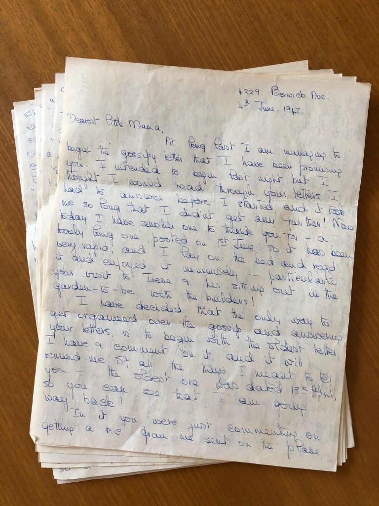 At long last I am managing to begin the gossipy letter but I have been promising you. I intended to begin last night but I thought I would read through your letters I had to answer before I started and it took me so long that I didn’t get any farther! Now today I have another one to thank you for- a lovely long one posted on 1st June, so it has been very rapid, and I lay on the bed and read it and enjoyed it immensely – particularly your visit to Irene & her sitting out in the garden-to-be with the builders!