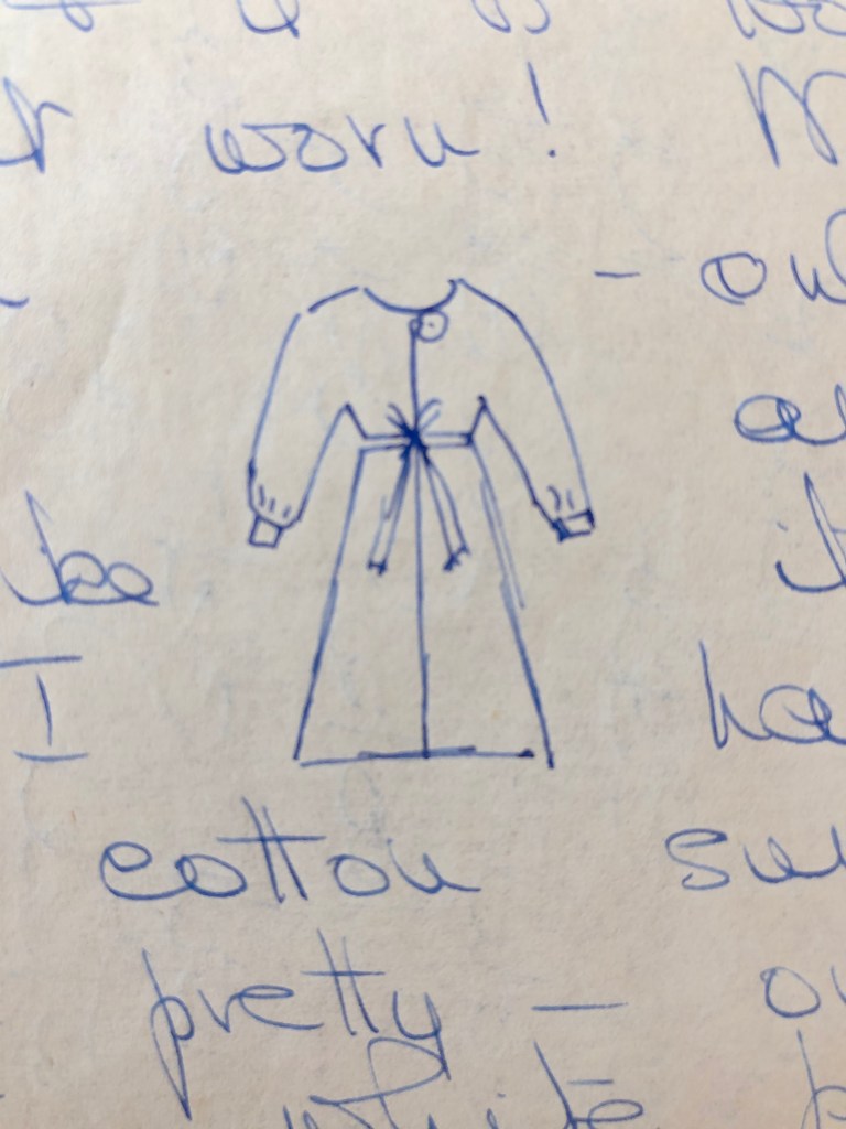 I told you about my gaudy jersey dress & as well as that I got a pink felt hat and pink suede gloves, which I wear with my blue corduroy suit or my navy 2 piece dress (I cover the red belt up) & with some of my other dresses, so it is very useful. The hat is one of the biggest I’ve ever had, but it’s kind of turned up, so people say it makes me look tall! I’ll attempt to draw it, but I have no idea whether I will succeed!!