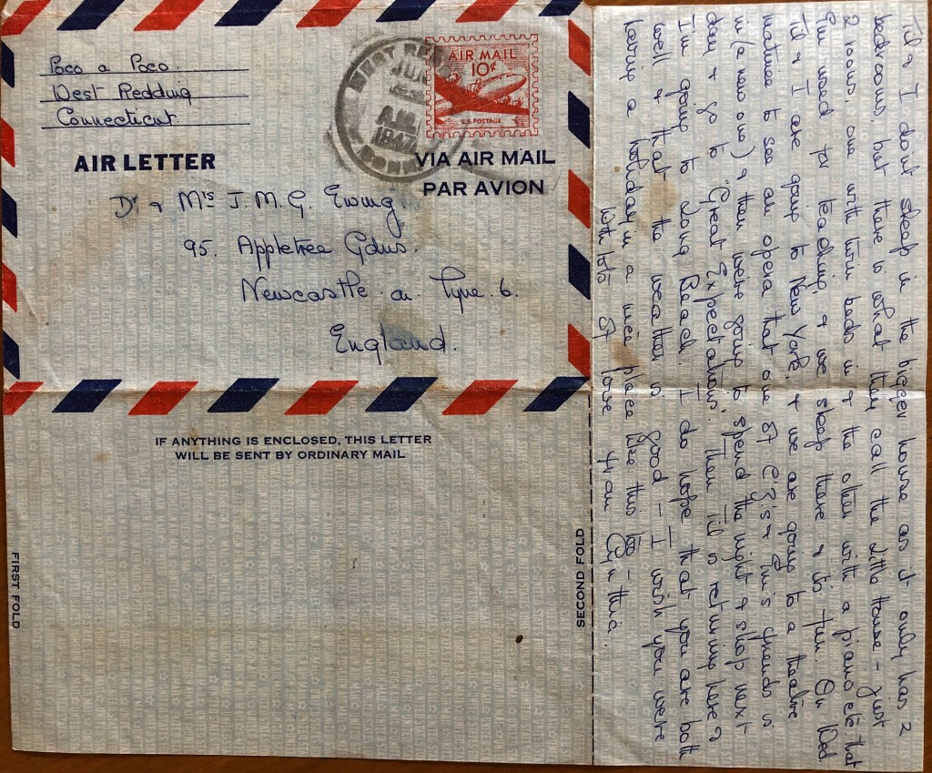 We arrived here about 6 o’clock on Tuesday & I fell in love with the place at once. Connecticut itself is lovely, with wooded hills & little towns & a very country look about it, & Poco just fits in. You drive off the road, bordered with little low grey stone walls, along a little lane through the woods, & there in a hollow amongst the trees sits the little white house. It looks so sweet, just like a house in a fairy tale because there is no proper garden or fences or anything, you just walk out of the house into the woods, & here & there are flowers growing in little clumps under the trees, or a rose bush growing up a rock, and the birds singing all the while. There are 4 acres of land- hills and valleys, wooded, & a ridge from which you get a beautiful view of the other hills. Til’s sister, C’Zelma, is the one who has been so ill- her face is still partially paralyzed, & she is still weak & has to rest a lot, but she is much better- her friend who lives with her is Em Smith (from Kentucky) & they both used to teach music, but since C’Zelma’s illness they have given it up, & are going to spend winters with Grandma in Alabama growing nuts, & summers up here. I like them all very, very much- Grandma too – they are fun & like me & are awfully nice to me. We have a nice time just doing as we like- Til & I go into the little town Danbury sometimes in the mornings, & I have bought a pair of dungarees to mess about in! In the afternoon, the ladies rest & I sit under the trees & just love it, then we sometimes go for a drive. One day we took our supper down & ate it by the sea, & twice we have cooked lunch outside on the grill under the trees – I made the charcoal fire & cooked the hamburgers on it!
