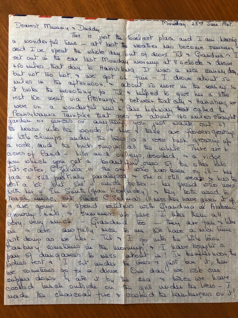 This is just the loveliest place and I am having a wonderful time – at last the weather has become summery and I’ve spent the whole day out of doors. Til & Grandma & I set out in the car last Monday morning at 8 o’clock & drove 450 miles that day to Harrisburg. It was a nice sunny day, but not too hot, & we got on fine- I drove about 50 miles in the afternoon, & about 50 more in the evening, so it broke the monotony for Til & helped to give her a little rest. We went via Pittsburgh, & between that city & Harrisburg we were on a wonderful new 4-lane highway called the Pennsylvania Turnpike that goes for about 160 miles straight through the Allegheny Mountains. You pay a toll to use it because it is so much quicker & it is really marvellous because there are no crossroads or intersections, no houses or built up areas, only petrol stations & restaurants here & there & tunnels (6 of them) that go right through the mountains. We entered the highway at about 4, & then had dinner at a restaurant called Midway, & of course had to go on until we had finished as there are no hotels or anything along the road. By the time we got to Harrisburg we were glad to stop & spent the night in a very nice Tourist House. Next day we only had 250 miles to go, but the roads had a great deal of traffic and were mostly narrower & more winding so we didn’t get on so quickly. We didn’t go into N.Y. but skirted around & went across the Hudson by Bear Mountain Bridge, which was lovely scenery- in fact the whole way with the mountainous scenery was beautiful.