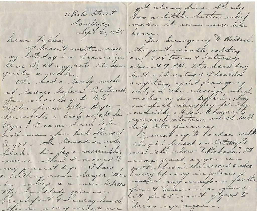 We had a lovely week at Cannes before I returned. You should get Al’s letter from Mrs. Bryce – he writes a book on all his trips! I came back to be best man for Bob Stewart Aug 28 – the Canadian who broke his leg & married his nurse. Then I moved to my present digs – I have a sitting room, larger than in college & a nice bedroom. My landlady gives me breakfast & Sunday lunch. She is very nice & we get along fine. She also has a little kitten which makes it seem more like home.