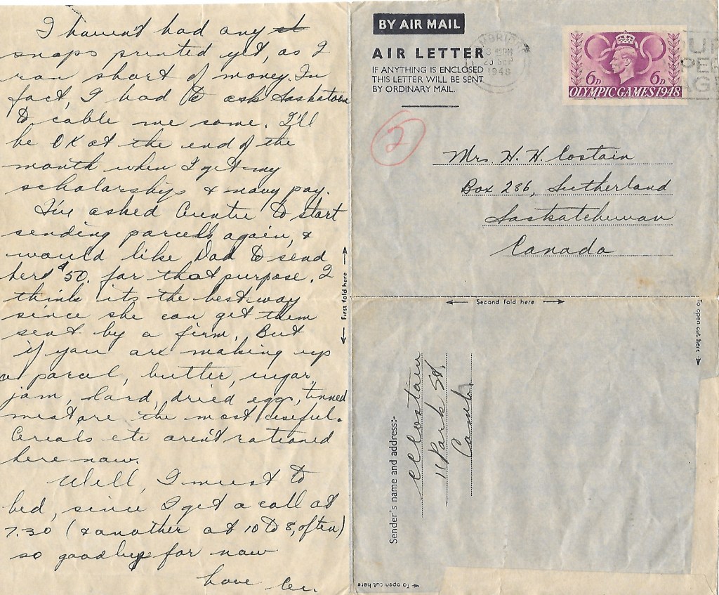 I’ve asked Auntie to start sending parcels again, and would like Dad to send her $50 for that purpose. I think it’s the best way since she can get them sent by a firm. But if you are making up a parcel, butter, sugar, jam, lard, dried eggs, tinned meat are the most useful. Cereals etc. aren’t rationed here now.