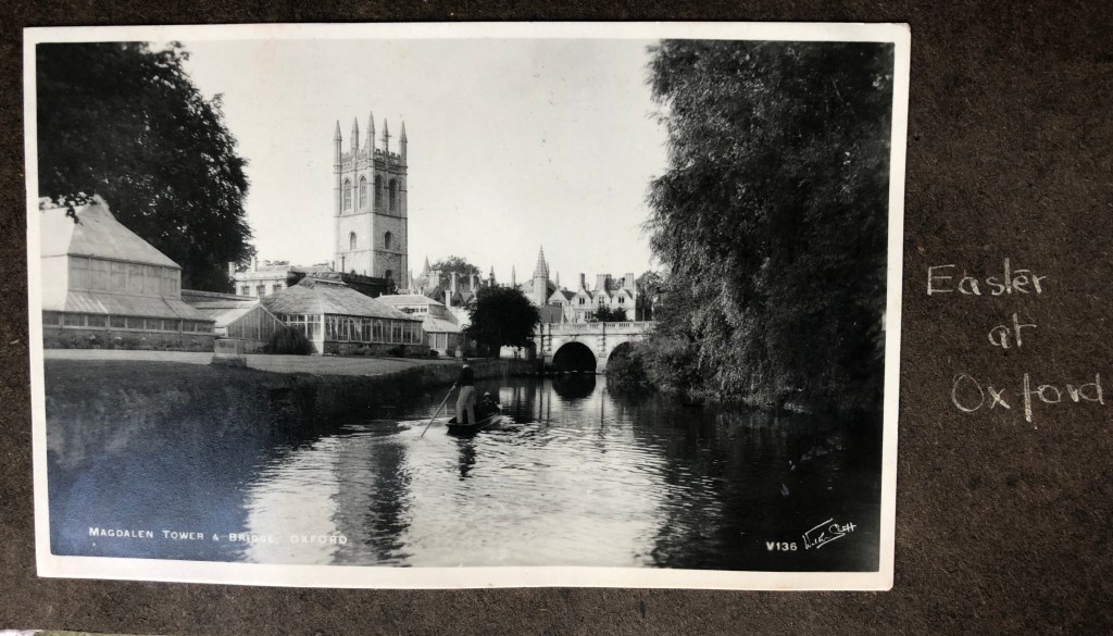 For the actual Easter weekend, they collected Carol from Cambridge and went to Oxford, to visit Cec’s friends at the other university. I imagine Cyn is on the bank taking pictures of her mother enjoying the experience of punting in Oxford-something she probably never had time for in Cambridge!