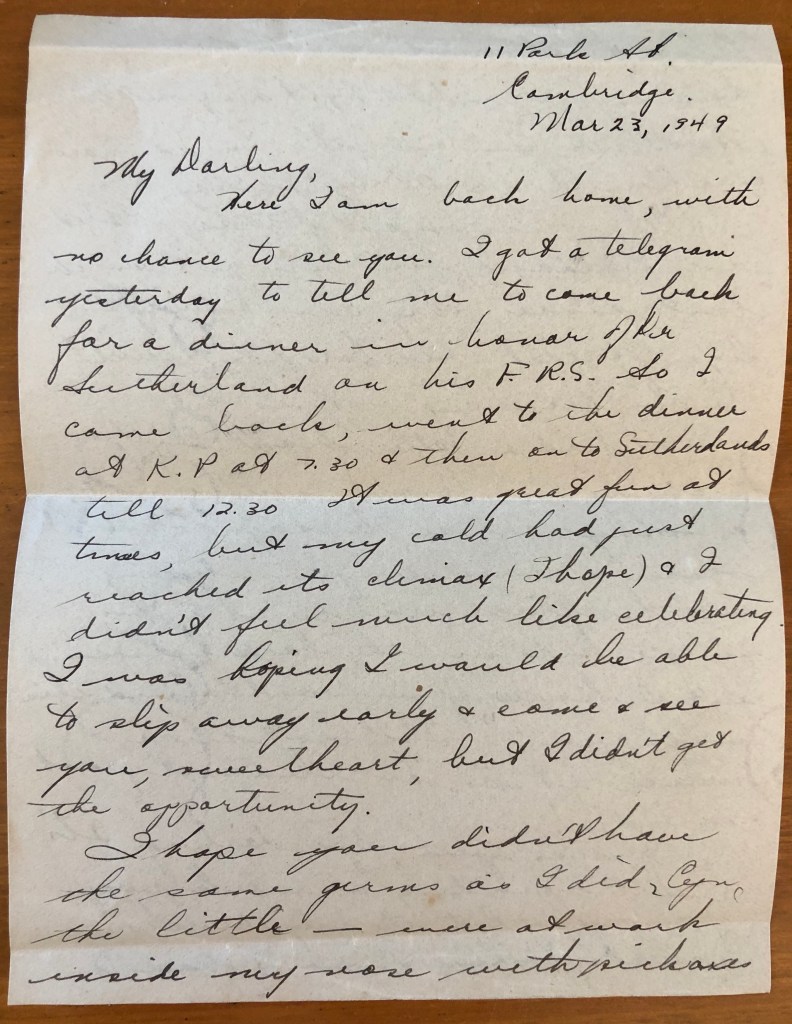 Here I am back home, with no chance to see you. I got a telegram yesterday to tell me to come back for a dinner in honour of Dr. Sutherland on his F.R.S. So I came back, went to the dinner at K.P at 7:30 & then onto Sutherlands till 12:30. It was great fun at times, but my cold had just reached its climax (I hope) & I didn’t feel much like celebrating. I was hoping I would be able to slip away early & come & see you, sweetheart, but I didn’t get the opportunity.