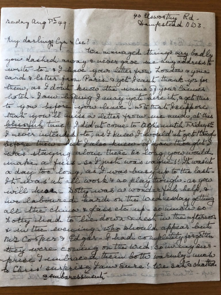 Explanations of people in the letter: AGL is Miss Lefroy, who had attended the wedding with her partner Miss Hull, and then returned to Hampstead, where Carol would go for a visit after clearing up and packing. Dotty, one of Cyn’s closest friends, was helping Carol, as were other friends (les girls) clear up; Cec’s friends (les boys) were available for the heavy lifting; and Carol’s friends from Newcastle were popping in as well, looking at the wedding presents, and taking her out for meals! Once Carol gets to London, her niece Bebe from New York (in her mid 20s I think) calls her up and Carol contributes to Bebe’s whirlwind tour of Europe with a river tour up the Thames.