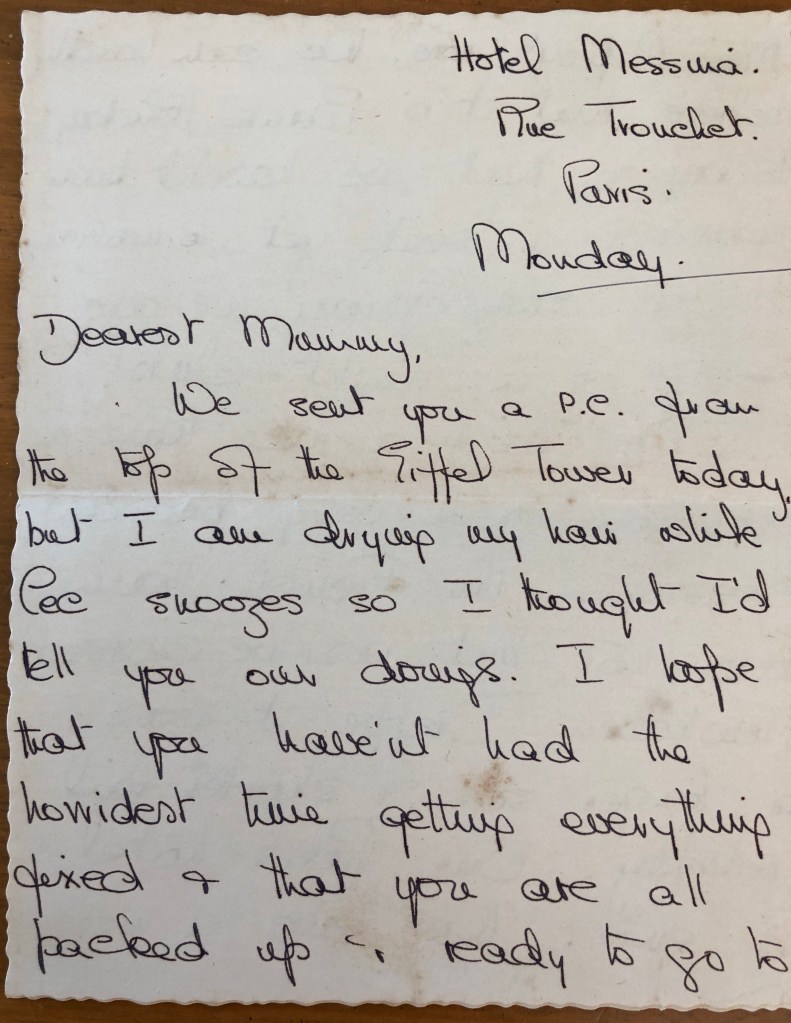 Cyn says in her letter that crossing the Channel was fine and they enjoy Paris.  They plan to go south, Avignon, Le Corniche D’Or, Cannes- some of the same places that Cec had been the summer before on his bicycling trip, but with a lot more luxury.  But nowhere does Cyn give her mother an address, although Cec had carefully booked in advance.