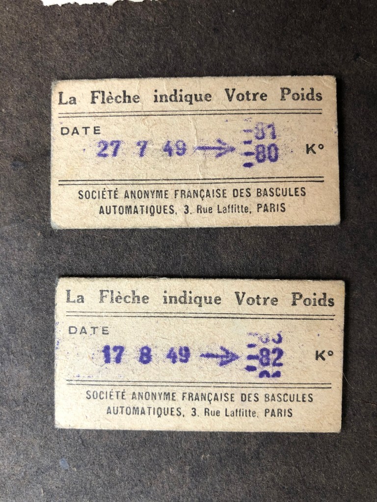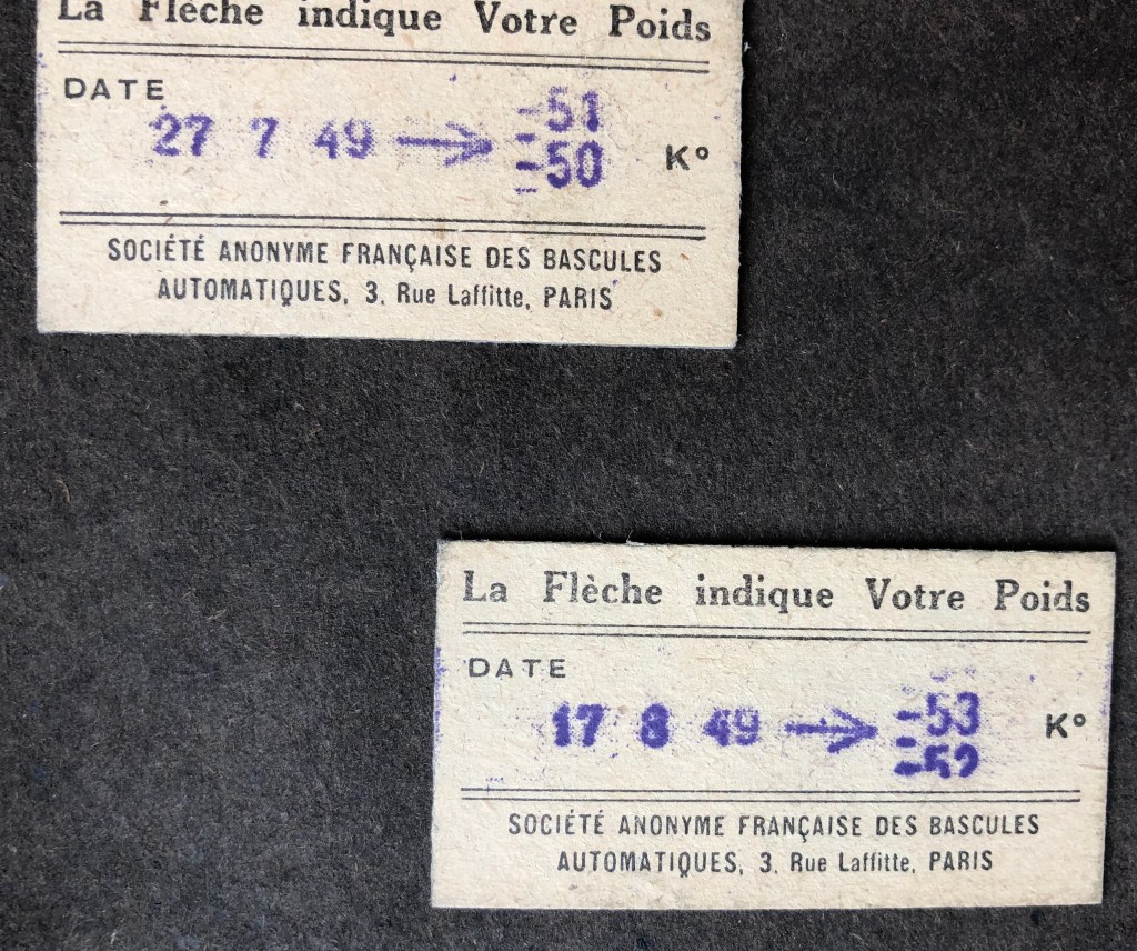 Halfway through Carol’s unsent letter, she started responding to this letter from Cyn, which was posted the day after the British Bank Holiday, on Tuesday August 2, 1949. There were machines at railway stations, and perhaps on the Metro, where you could put in a coin, stand on the machine, and get a printout of your weight.  Cyn and Cec did this, at the beginning and end of their honeymoon, and Cyn carefully saved the evidence and pasted it into her scrapbook.  Both of them definitely gained weight!