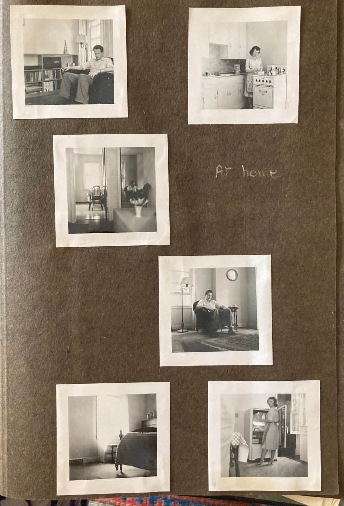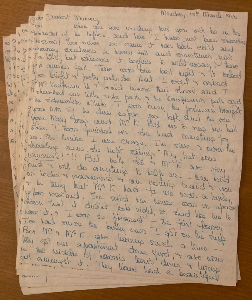 When you are reading this you will be in the midst of the tropics, and here I have just been shovelling snow! Ever since we came it has been cold and snowy, sometimes a heavy fall, and sometimes just a little, but when ever it begins to melt away, there is another fall. There was one last night & it looked so bright & pretty outside then I went & asked Mrs. Kaufman if I could borrow their shovel, and I shovelled our little side path & Kaufman’s path and the sidewalk. While I was busy the postman brought your A.M. of the day before you left, and the one from Mary Ewing, and Mrs. K. told me to ring her bell when I was finished and she had something for me. She thinks I am crazy, I’m sure, & over the shovelling snow, she kept saying “My, but how unusual!”!! But both she & Mr. K. are very kind & will do anything to help us – they lend us books & magazines & an ironing board & iron, and the thing that Mrs. K had for me was a lovely yellow rosebud. She said her house is so upside down that it didn’t look right, so she’d like me to have it, & I was so pleased – the first flower I’ve had since the lovely ones I got on the ship. Poor Mr. & Mrs. K. are having such a time- they got our apartment done first, & are now in the middle of having theirs done & living all amongst it. They have had a beautiful new bathroom built, & all the kitchen remodelled & modernized & are having a new cooker & frig. & the stairs were moved when our place was made separate. They have the carpenter here for long enough, & tiler is coming off & on to put tiles in the kitchen & Mr. K. is painting doors & the decorators have yet to come. They have everything under dust sheets and no carpets & poor Mrs. K. just sits in a chair in the corner as the only comfortable place! She is little- about 50, but dark, while he is even smaller I think & grey & thin – but about 50 too. He has quite a sense of humour, but I don’t think she has as she doesn’t laugh at any of my remarks, but takes them quite seriously! However, we have a long chats when I go to borrow anything, & she was telling me that she came with her parents from Russia when she was a girl – Mr. K came from Manchester, I think I told you. They have 2 girls, both married- the eldest with 2 little boys & the youngest just married in Sept. & her husband doing medicine at the University – I haven’t seen any of them yet.