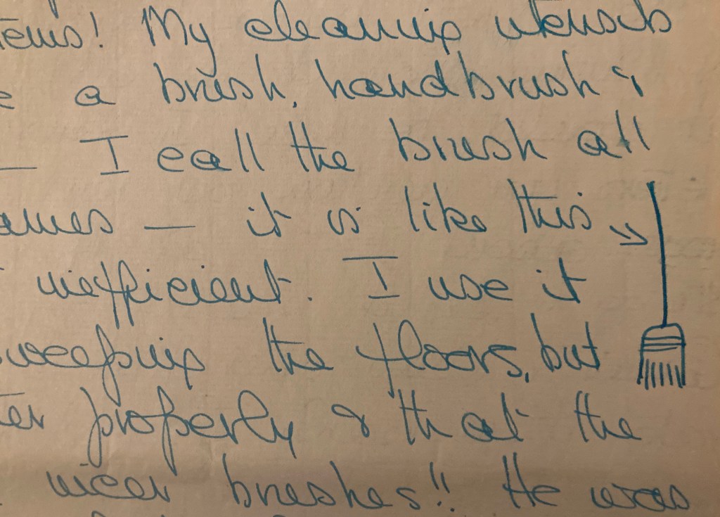 & I say it is most inefficient. I use it for carpets & for sweeping the floors, but tell Cec it does neither properly and that the English have much nicer brushes!! He was most amused in the shop when we got it, because I acted so amazed at such a thing, that he said the man would think I was some poor little rich girl, who’d never seen such a thing as a broom in her life!