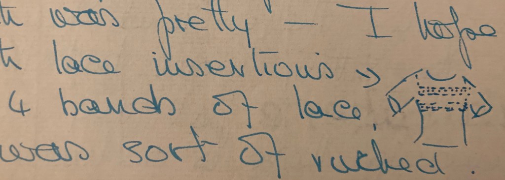 Actually there were 3 or 4 bands of lace, & the material between was sort of ruched. I enjoyed your letter all about the party at the Savoy so much, & was very glad you told me all about the clothes & food & celebrities & everything. It sounded as if it must have been really nice & I am awfully glad that you went, even if you did have misgivings beforehand!