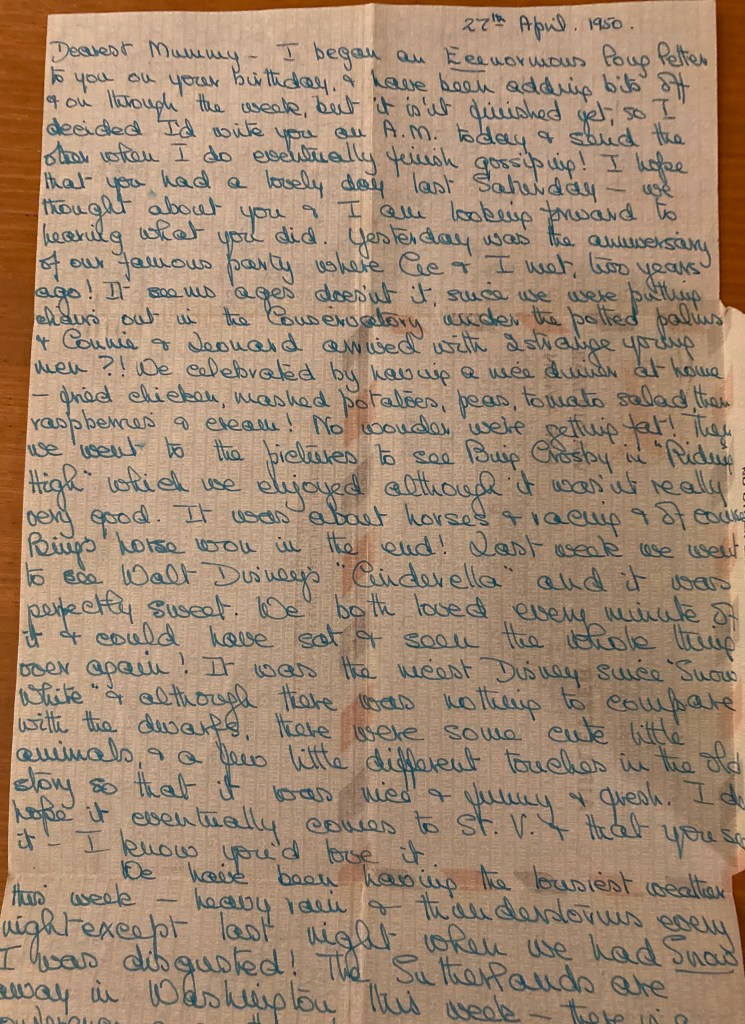 I began an Eeenormous long letter to you on your birthday, & have been adding bits off & on through the week, but it isn’t finished yet, so I decided I’d write you an A.M. today & send the other when I do eventually finish gossiping! I hope that you had a lovely day last Saturday – we thought about you & I am looking forward to hearing what you did. Yesterday was the anniversary of our famous party where Cec & I met, two years ago! It seems ages doesn’t it, since we were putting chairs out in the Conservatory under the potted palms & Connie & Leonard arrived with 2 strange young men?! We celebrated by having a nice dinner at home- fried chicken, mashed potatoes, peas, tomato salad, then raspberries and cream! No wonder we are getting fat! Then we went to the pictures to see Bing Crosby in “Riding High” which we enjoyed although it wasn’t really very good. It was about horses & racing & of course Bing’s horse won in the end! Last week we went to see Walt Disney’s “Cinderella” and it was perfectly sweet. We both loved every minute of it & could have sat & seen the whole thing over again! It was the nicest Disney since “Snow White” & although there was nothing to compare with the dwarfs, there were some cute little animals, & a few little different touches in the old story so that it was nice & funny & fresh. I do hope it eventually comes to St. V. & that you see it – I know you’d love it.