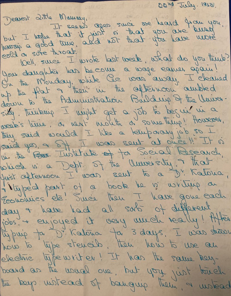 Well, since I wrote last week, what do you think? Your daughter has become a wage earner again! On Monday, while Cec was away, I cleaned up the flat & then in the afternoon ambled down to the Administration Building of the University, thinking I might get a job to begin in a week’s time, or next month or something! However, they said would I like a temporary job, so I said yes, and off I was sent at once!! It is in the Institute for Social Research, which is a Dept. of the University, & that first afternoon I was sent to a Dr. Katona, & typed part of a book he is writing on Economics etc.! Since then I have gone each day & have had all sorts of different jobs, & enjoyed it very much really! After typing for Dr. Katona for 3 days, I was shown how to type stencils, then how to use an electric typewriter! It has the same keyboard as the usual one, but you just touch the keys instead of banging them, & instead of each letter taking the same space, the thin letters like i only take 2 “units” as they’re called & the fat ones like m take 5, so the finished result is very neat & looks more like the page of a book. I typed a great long article on Atomic Energy Control on that on stencils, then learnt how to work a mimeographing machine & stencilled off 100 copies of the article. Another day I learnt how to use a dictaphone, & typed the minutes of a meeting from one, so I have been having fun!