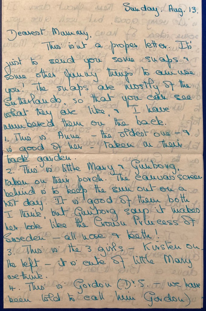 This isn’t a proper letter. It’s just to send you some snaps & some other funny things to amuse you! The snaps are mostly of the Sutherlands, so that you can see what they are like, & I have numbered them on the back.