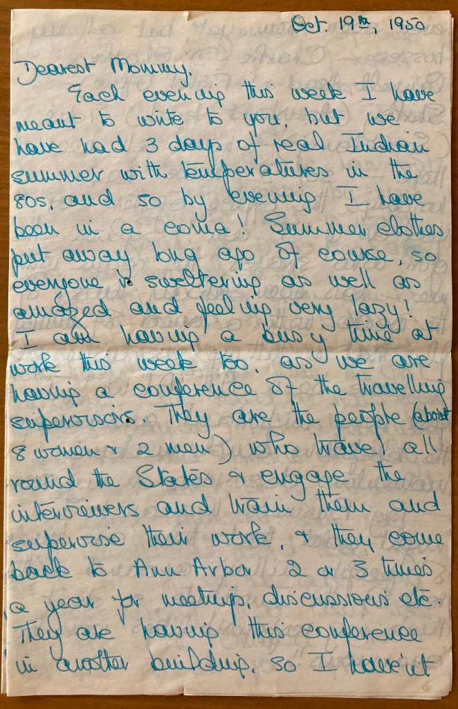 Each evening this week I have meant to write to you, but we have had three days of real Indian summer with temperatures in the 80s, and so by evening I have been in a coma! Summer clothes put away long ago of course, so everyone is sweltering as well as amazed and feeling very lazy! I am having a busy time at work this week too, as we are having a conference of the travelling supervisors. They are the people (8 women & 2 men) who travel all round the States & engage the interviewers and train them and supervise their work, & they come back to Ann Arbor two or three times a year for meetings, discussions etc. They are having this conference in another building, so I haven’t even seen them yet, but all my bosses- Charlie ( Dr. Charles Cannell Head of Field Office)- Shirley, (Assistant Head)- Edie (Secretary) – have all been there – so I have been holding the office together – or feel as if I am!