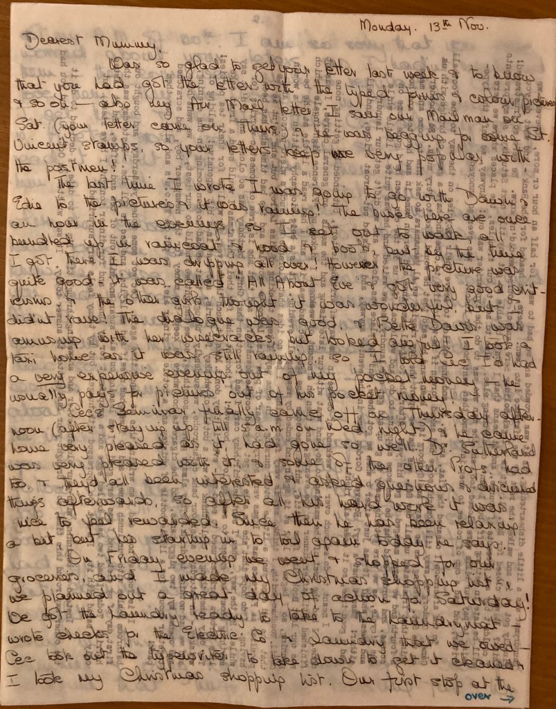 Instead of beginning with your oldest letter and answering through till I’m up-to-date, I decided to do it the other way around this time, so I brought your last letter to answer today. It was written on October 30, and you had got my A.M. of 20th. I am so sorry that you were worried about your letters, as I haven’t mentioned them – they come very nicely & regularly & Cec & I love them. They are waiting in the evening when I get home & the first thing Cec always says is “A letter from your Mummy”, so I sit down & read it right then & there, then hand it onto him to read while I go & get dinner!