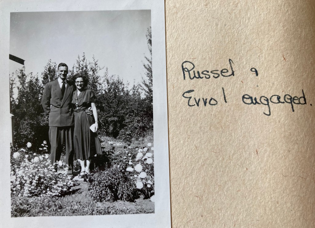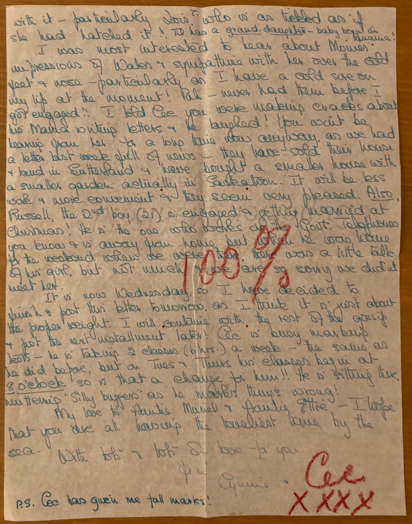 I was most interested to hear about Monie’s impressions of Wales & sympathise with her over the cold feet and nose – particularly as I have a cold sore on my lip at the moment! Pah! -never had them before I got engaged!! I told Cec you were making cracks about his Mama writing letters & he laughed! You won’t be hearing from her for a long time now anyway, as we had a letter last week full of news – they have sold their house & land in Sutherland & have bought a smaller house with a smaller garden actually in Saskatoon. It will be less work & more convenient & they seem very pleased. Also, Russell, the 2nd boy (21) is engaged & getting married at Christmas! He is the one who works on the Govt. Telephones you know & is away from home, but when he was home for the weekend when we were there, there was a little talk of his girl, but not much & we are so sorry we didn’t meet her.