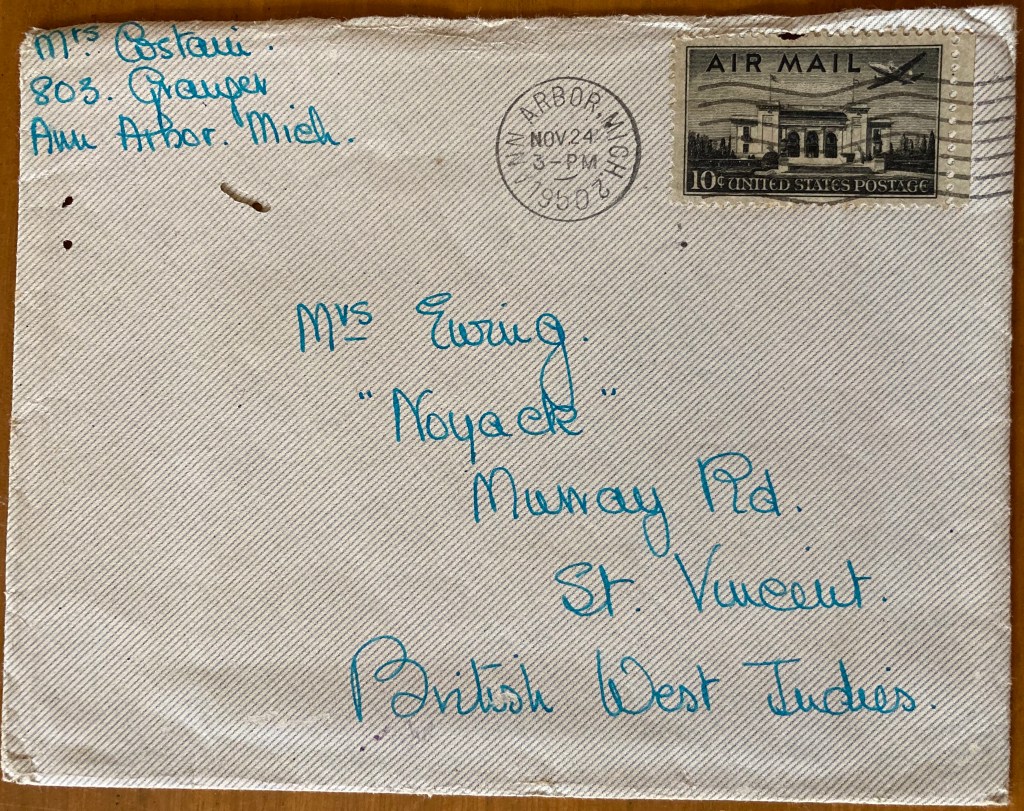 A note about Carol’s ‘holiday’ in St Vincent that Cyn refers to. In her stories about her Mother’s childhood, she told about the way the family would go on an excursion for the day, packing the children into a wagon with driver and servants to take hours to go from the town to Villa 6 miles away, while the ladies followed later in the carriage and the gentlemen rode horses. Once there, they would swim, picnic, the children would play, the ladies rest, and the gentlemen would inspect the Isolation Hospital on the tiny island opposite the beach, where the French fort from the Napoleonic wars remained. [The story ‘After the Hurricane 1898’ which I posted back in January.] Now it appears that bungalows have been built by that beach, and the Hazell sisters have moved out of town for a bit of R&R in one of them, enjoying the same things that they had done as children. This was a tradition that Cyn & Cec were to continue- staying out there for part of our holiday when I was 6, and renting one for their winter holidays once my brother and I were at university!