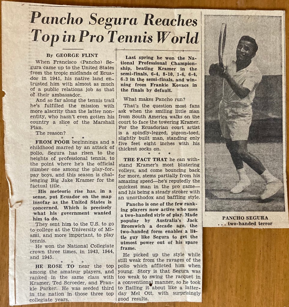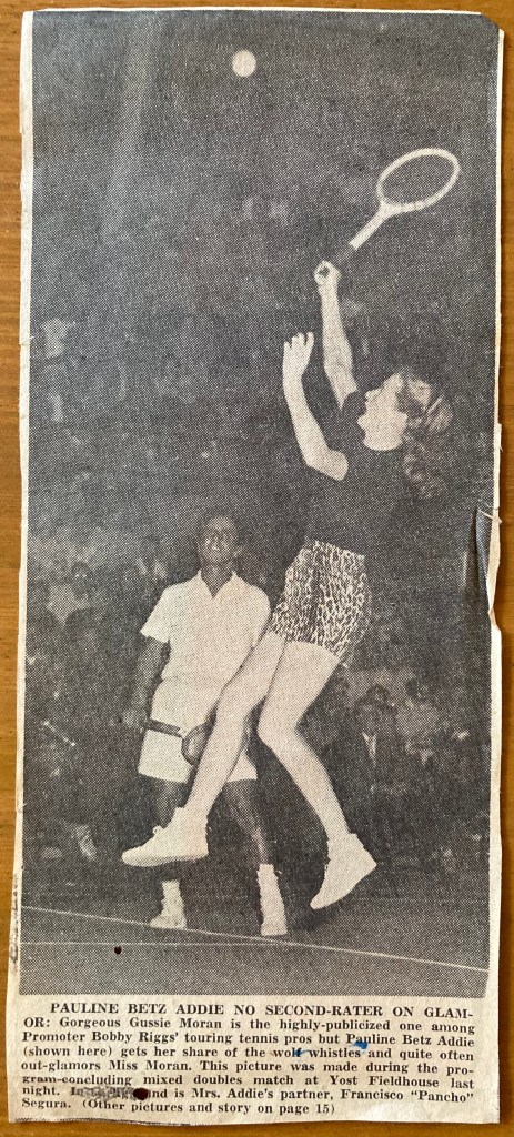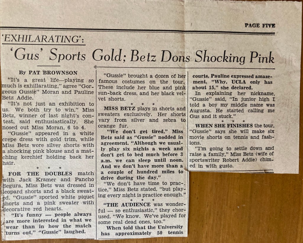 On Thursday evening Cec & I & Gunborg went to see a professional tennis match which was given in the big University Field House. Gorgeous Gussy was playing, & Pauline Betz- then Jack Kramer & Pancho Segura. We had a grand time & thoroughly enjoyed it- the tennis was wonderful – girls singles (Pauline won) men’s singles (Pancho won) then a doubles when Gussie & Kramer won. Besides the tennis of course we were all tickled to see Gussie who wore her lace pants & was a honey, but Pauline was bound & determined to out-do her & wore silver lamé shorts & then leopard skin shorts! We still liked Gussie best, & we thoroughly enjoyed the good sportsmanship & good spirit there seem to be. Pancho was the funniest little man – small & bowlegged (he had polio) but like a flash on the courts. It was a really good evening.