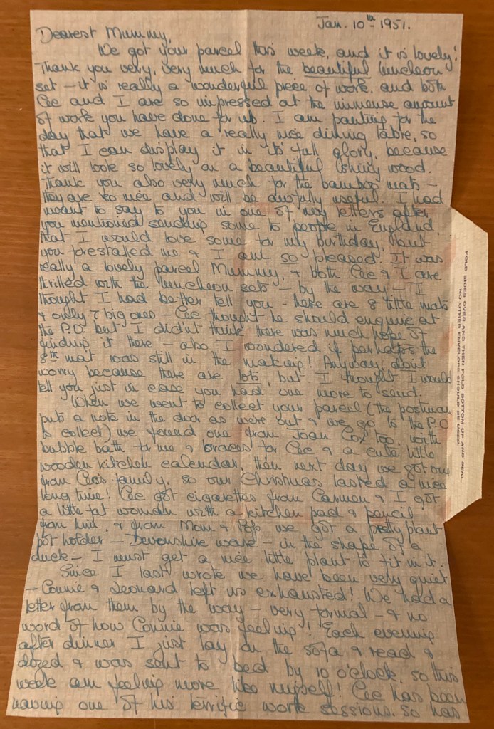We got your parcel this week and it is lovely! Thank you very, very much for the beautiful luncheon set – it is really a wonderful piece of work, and both Cec and I are so impressed at the immense amount of work you have done for us. I am panting for the day that we have a really nice dining table, so that I can display it in its full glory, because it will look so lovely on a beautiful shiny wood. Thank you also very much for the bamboo mats – they are so nice and will be awfully useful. I had meant to say to you in one of my letters after you mentioned sending some to people in England, that I would love some for my birthday, but you forestalled me & I am so pleased. It was really a lovely parcel Mummy, & both Cec & I are thrilled with the luncheon sets – by the way – I thought I had better tell you – there are 8 little mats & only 7 big ones – Cec thought he should enquire at the P.O. but I didn’t think there was much hope of finding it there- also I wondered if perhaps the 8th mat was still in the making! Anyway don’t worry because there are lots, but I thought I would tell you just in case you had one more to send.