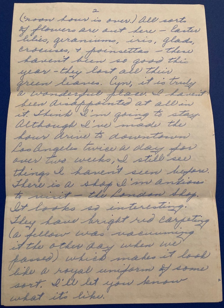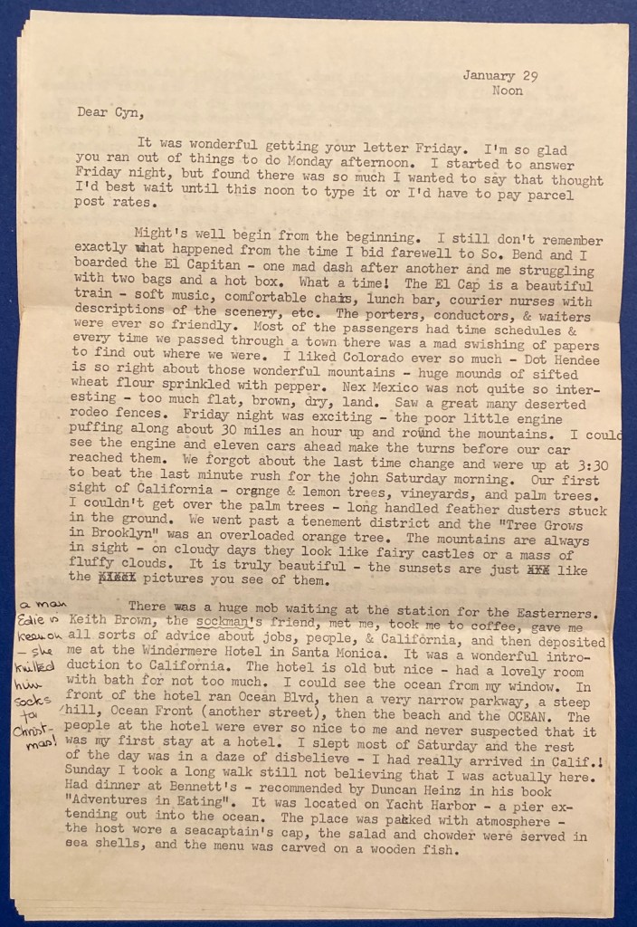 Cyn shared letters of interest with her mother, and this one, from her colleague Edie who had moved to California in December 1950, and was missed and mourned by Cyn at work, was annotated and sent on by Cyn. It gives an interesting impression of Los Angeles 70 years ago, as well as a rather sad impression of loneliness that I hope Cyn responded to.