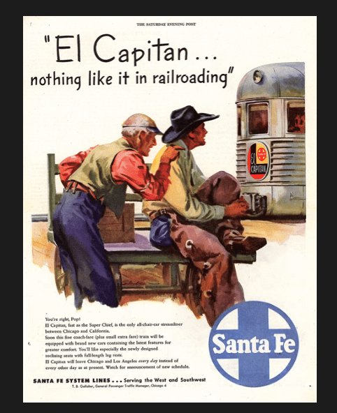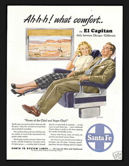 The El Cap is a beautiful train- soft music, comfortable chairs, lunch bar, courier nurses with descriptions of the scenery, etc. The porters, conductors, & waiters were ever so friendly. Most of the passengers had time schedules & every time we passed through a town there was a mad swishing of papers to find out where we were.