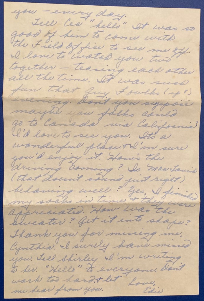 Tell Milly & Dawn to tell Jerry & Burt “hello”. I could go on and on here but think it’s best I stop until next time. If you ever run out of things to do again, Cyn, I’ll be ever so glad to hear from you- every day. Tell Cec “hello”. It was so good of him to come with the Field Office to see me off. I love to watch you two together- teasing each other all the time. It was such fun that Guy Fowlks (sp.)? evening. Don’t you suppose maybe you folks could go to Canada via California? I’d love to see you. It’s a wonderful place & I’m sure you’d enjoy it. How’s the driving coming? Is MacTavish (that doesn’t sound just right) behaving well? Yes, I finished my socks in time & they were appreciated. How was the sweater? Get it into shape? Thank you for missing me, Cynthia. I surely have missed you. Tell Shirley I’m writing to her. “Hello” to everyone. Don’t work too hard & let me hear from you.