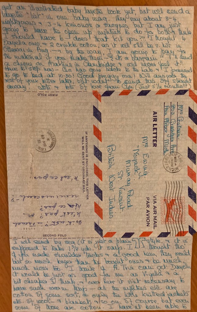 I thought tho’ if you made shoulder tucks & a good hem, they would last so much longer than the bought ones & be much much nicer too. I think if A. Trix can get Dayella it would be just as good for me as Viyella & a bit cheaper I think, & over here it isn’t necessary to have such warm things – all the nighties etc. are cotton of some sort, & only the little knitted jackets etc. of wool- & blankets & so on, of course, but even some of those are cotton. I haven’t been able to get an illustrated baby layette book yet, but will send a layette “list” in one baby mag. They say about 3- 4 nightgowns & 3-4 kimonos or sacques, but I am just going to have the open up nighties to do for both & think I should have 6 – does that kill you?!! I thought four Dayella ones, & 2 crinkle cotton, as it will still be v. hot in Ottawa in Aug. – & by the way, I am going to pay for the material if you make them – it’s a bargain! I’ll send a cheque on Martin’s in Cambridge & will never feel it!!